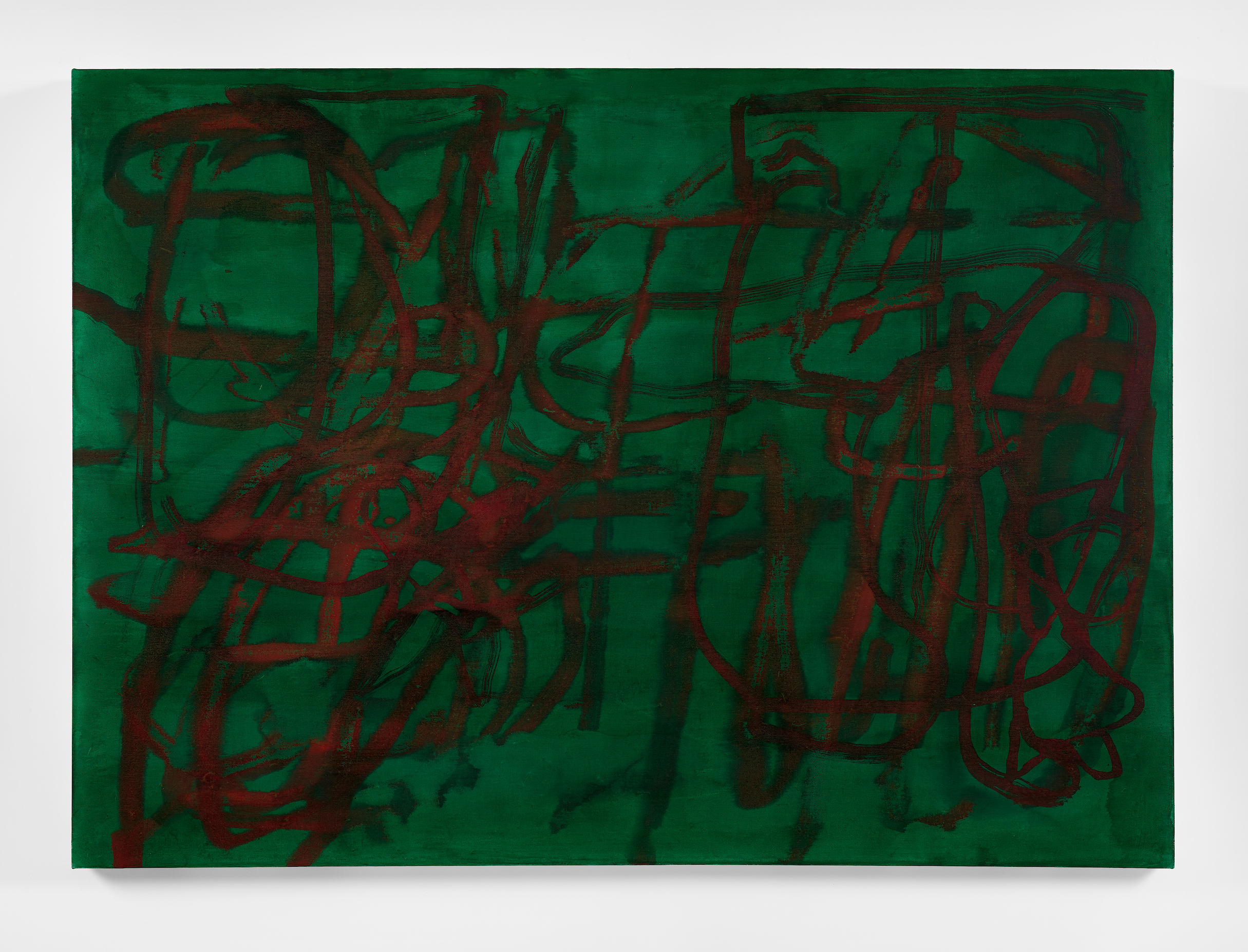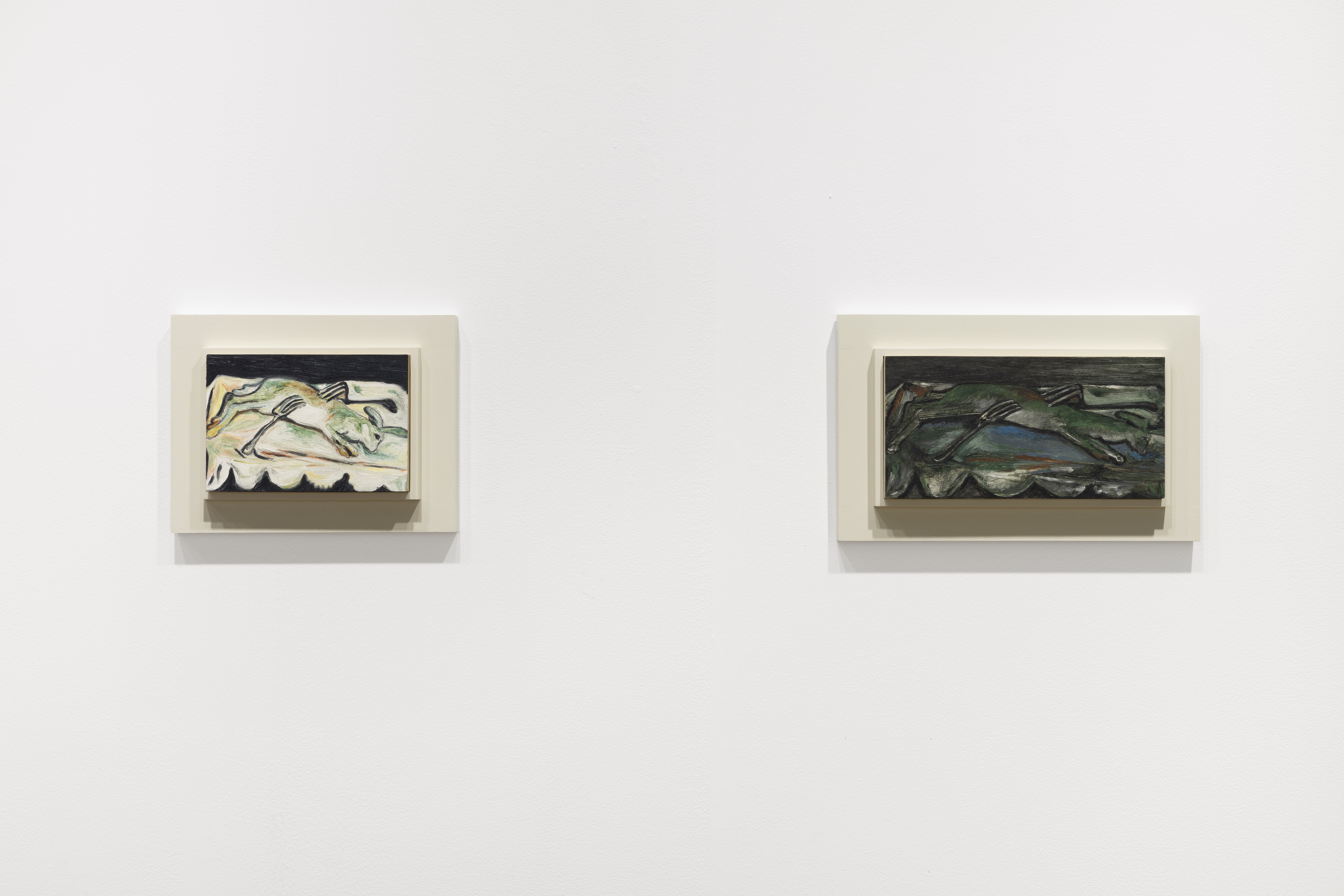 Brook Hsu engages with the history of painting to cast an aesthetically propulsive and emotionally charged orbit, intertwining human and non-human relationships. Furthering her exploration in abstraction is Untitled (2025), in which expressive red brushstrokes interact with her hallmark green ground to push saturation, intensity, and transparency into new perceptual territory. Two paintings, both titled Rabbit with Forks (2025), take their compositional cues and title from a 1924 painting by Chaim Soutine, extending Hsu’s ongoing interest in animals to game and meat, a daily presence in Wyoming where the artist splits her time, in dialogue with their art historical precedents. Through a technique of layering oil and pencil, Hsu activates the phenomenon of metamerism, where the objects appear identical or different in color depending on the light condition.