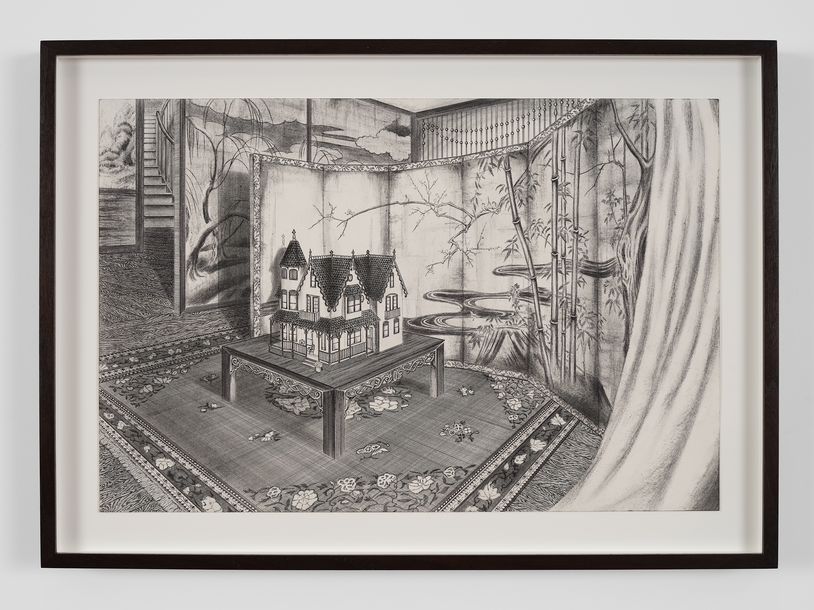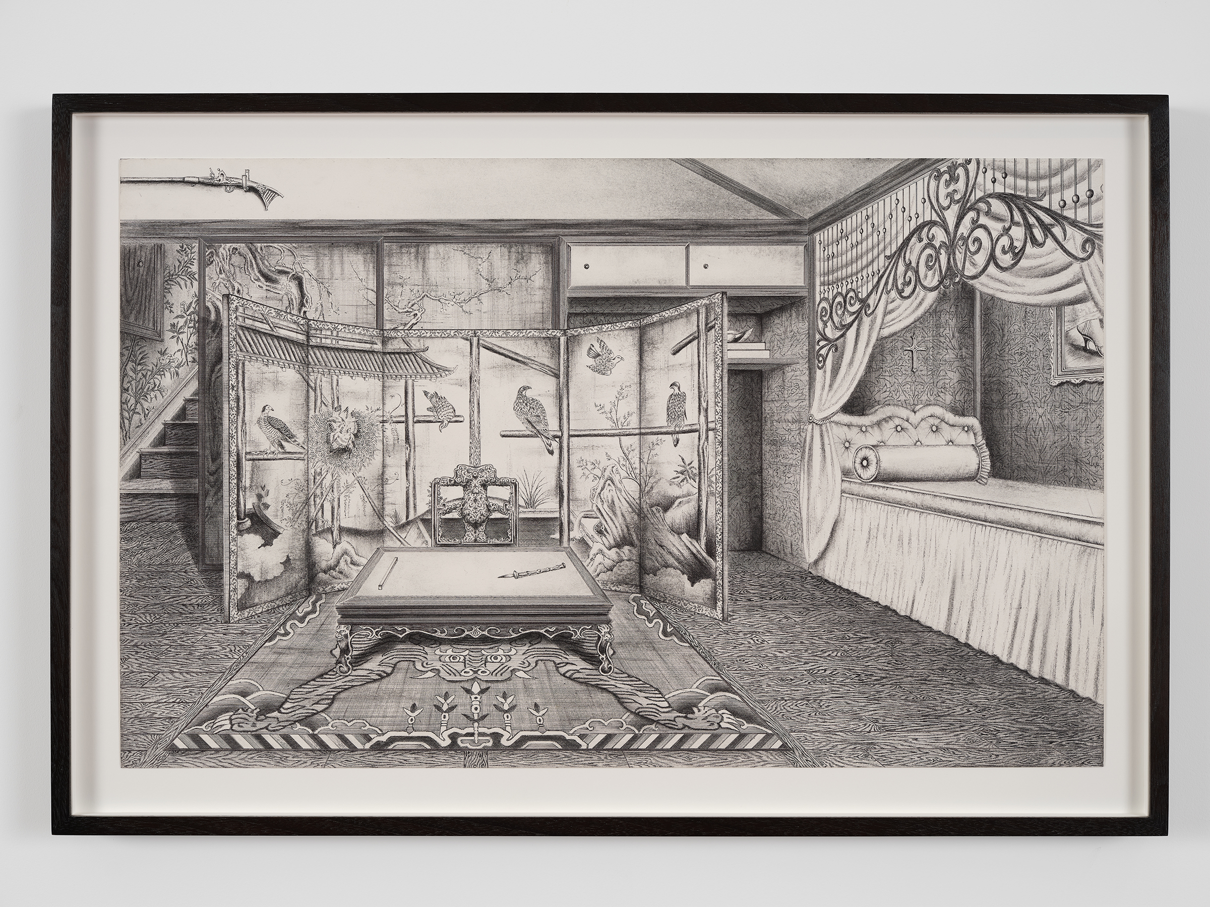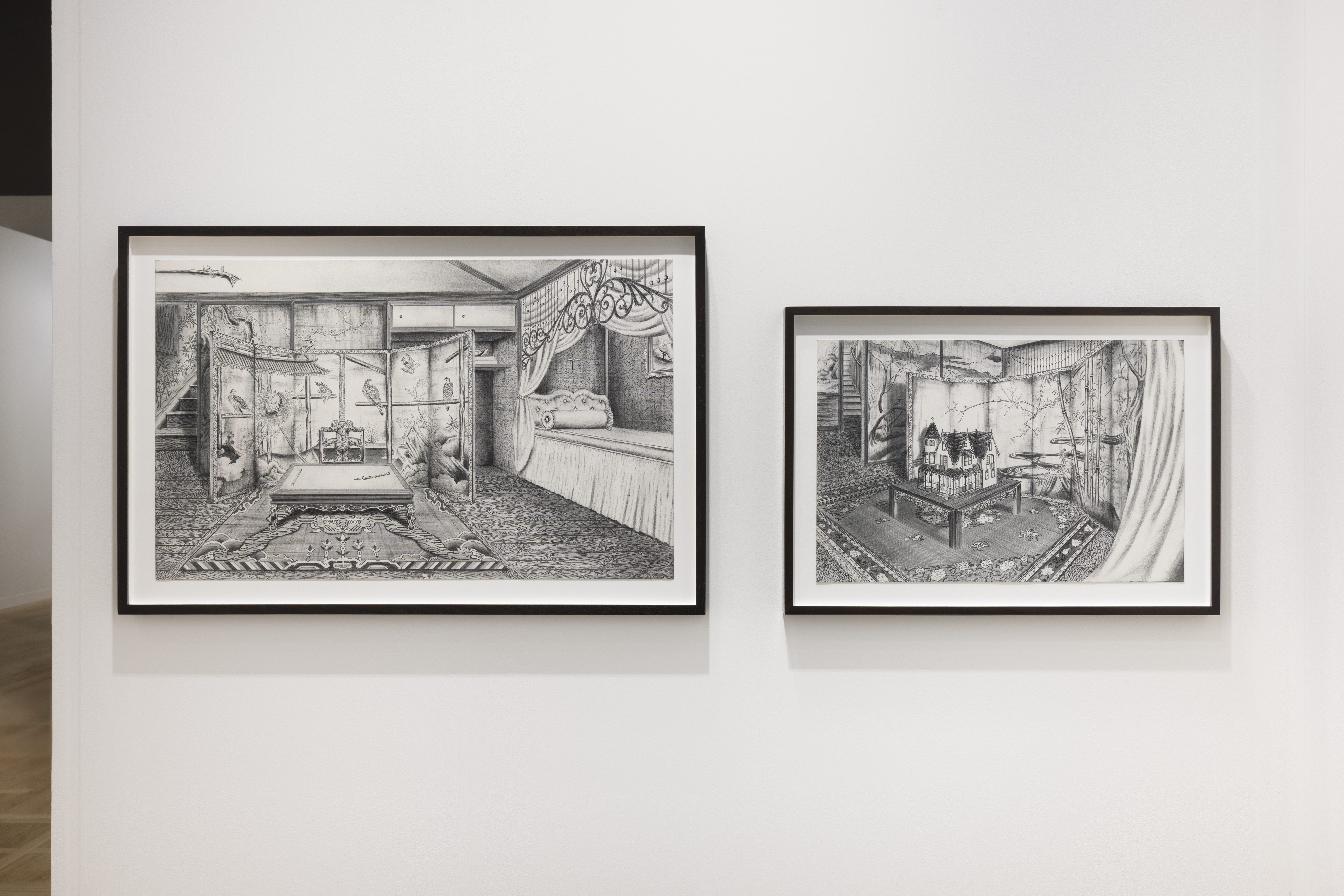 Kyung-Me’s psychologically charged drawing The Dollhouse (2025) presents a rare angled view of a chamber, in the centre of which is a delicate doll house in front of a classic Asian folding screen and an arrangement of Japanese shoji. The meticulously rendered textures—from the infinitesimal roof tiles of the doll house, the carvings on the elegant low table to the painted bamboos on the folding screen—are also abundant in The Study (2025), where objects, animals and religious symbols from the East and West are equally and radically exoticized. Akin to Kyung-Me’s interest in the temporal origin of space, Yuan Yuan was driven by the desire to delineate the time needed for a quasi-enclosed space to transpire in An intimate community (2017-2018). It speaks of the time-consuming act of painting itself, an impossible construction that deals with a precise and detailed space that is incongruent with itself.