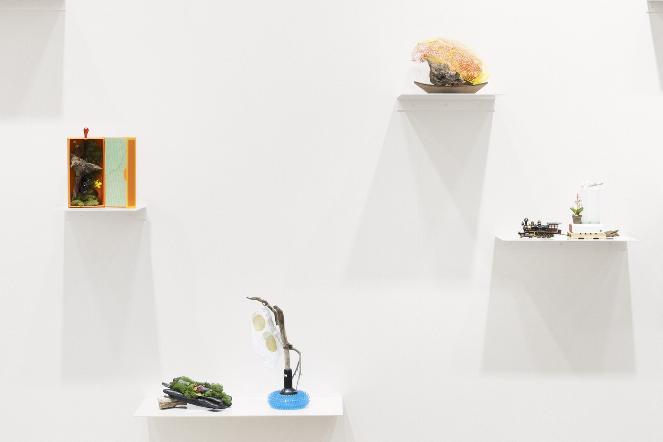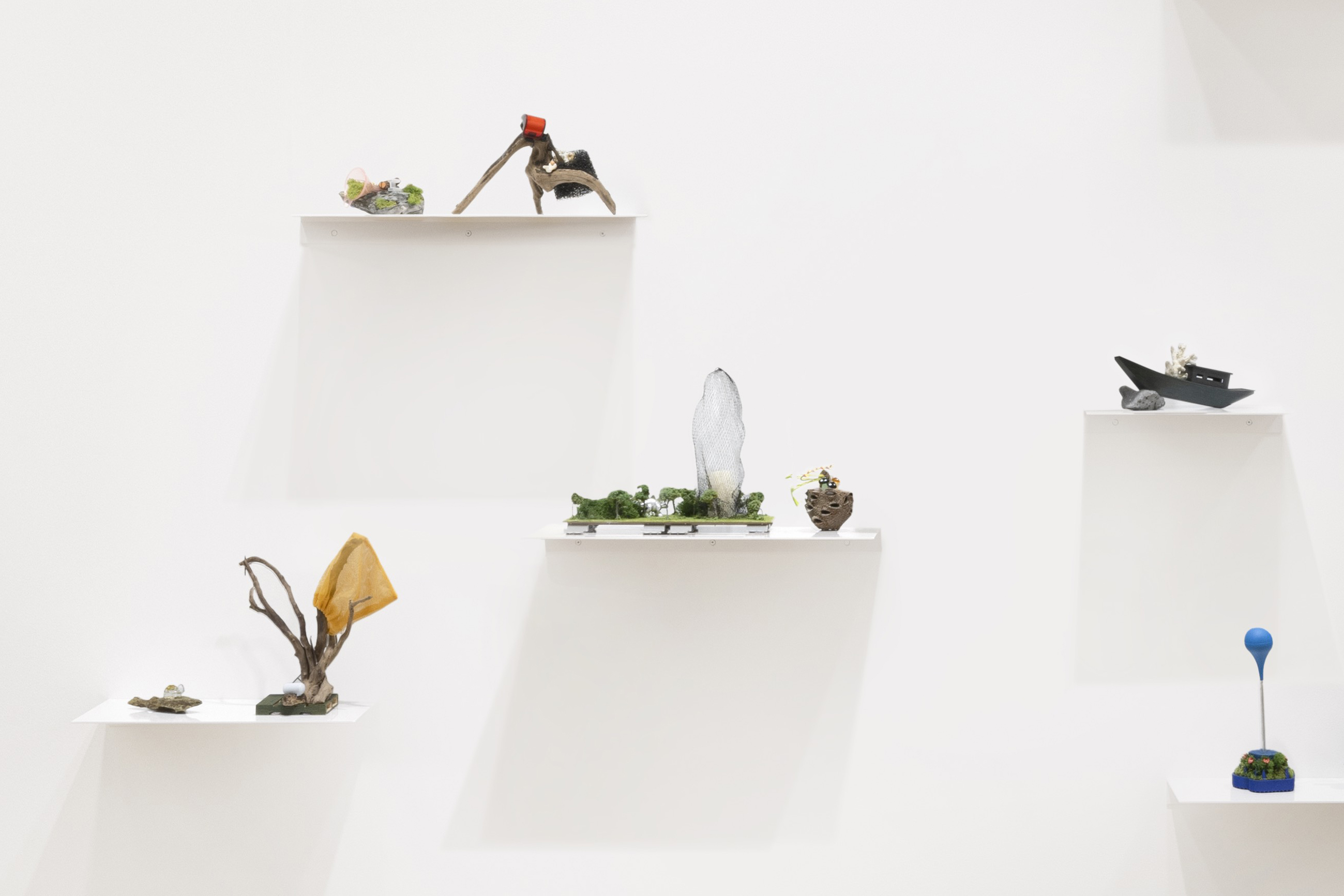 Highlights include Tiffany Chung’s the world through my mother’s cabinets of curiosities (2025), a mixed media installation composed of delicate miniature objects utilizing miniature plants, flowers, and knickknacks Chung’s mother collected over the years; dead corals that Chung picked up while researching in Ishigaki, Okinawa; leftover materials from her previous projects; rocks, driftwoods, and random things donated by friends and family. Chung’s whimsical mini sculptures humorously depict the ways in which objects we have accumulated reflect who we are. At the same time, the artworks bring new meanings to these objects embedded with personal histories by delineating our impact on the environment; our experience of disasters, migration and survival; the rebound and taking over of nature in the aftermath. Together with Chung’s ongoing works tracing earth’s deep time, prehistoric Neolithic monumental earthworks, and the ancient spice trade, the world through my mother’s cabinets of curiosities reminds us that the imprint of our past is carried into the future and that we are responsible for the care of creation and sustainable ecology, beyond human history.