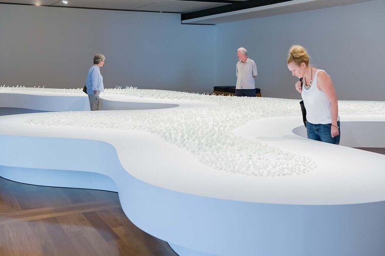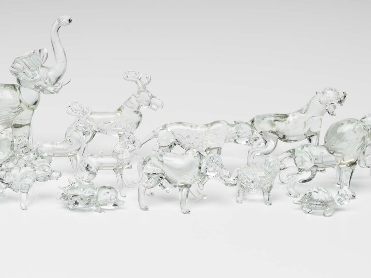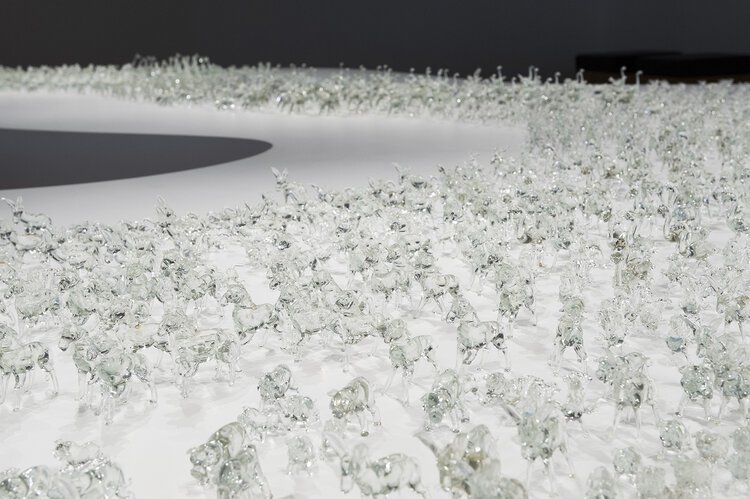 (Detail) roaming with the dawn: snow drifts, rain falls, desert wind blows, 2012. 4,000 hand-formed miniature glass animals, dimension of plinth: L 1,310 x W 700 x H 60 cm; dimensions of glass