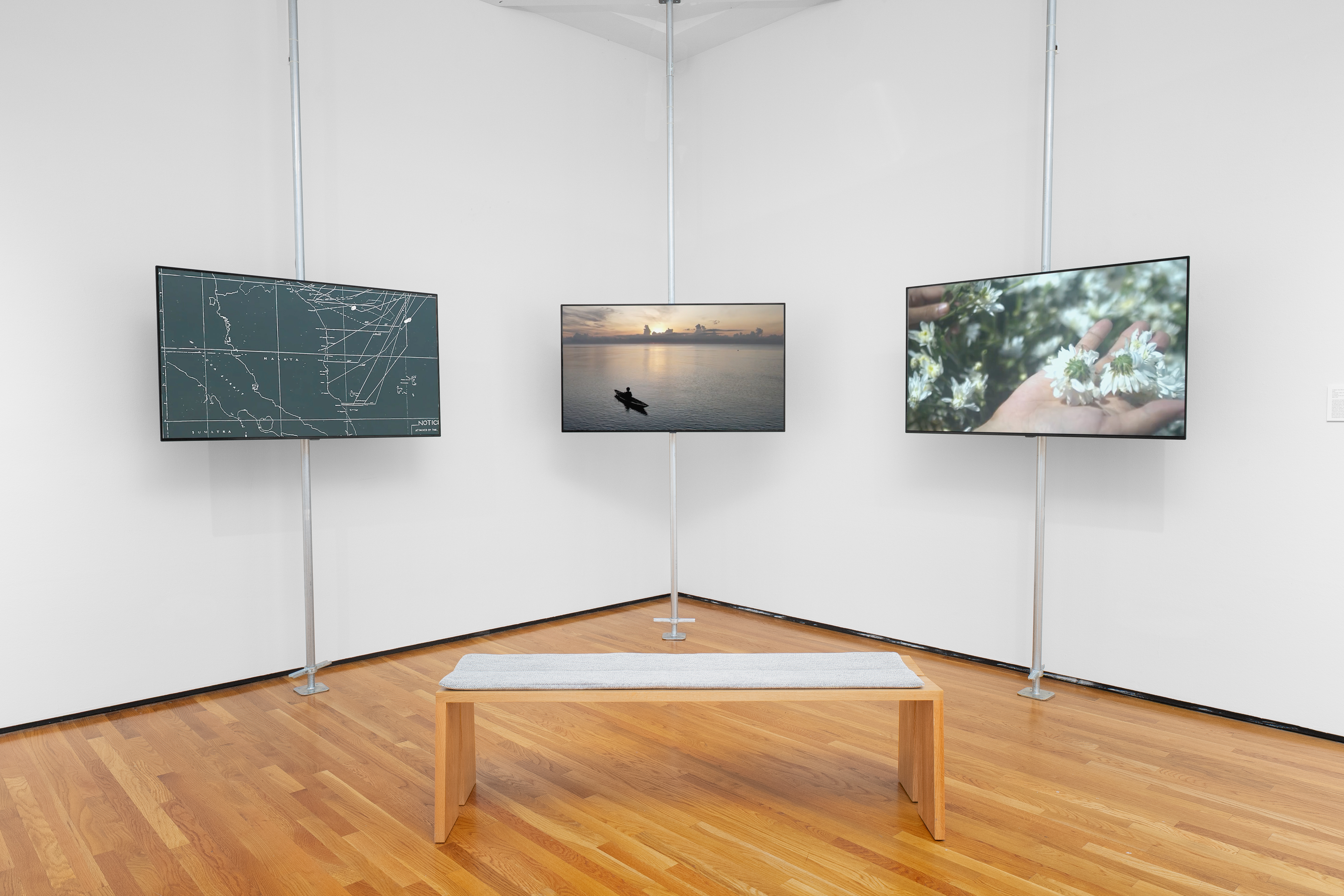 Tracking the cost of war, not in number but in forced displacement, Tiffany Chung retrieved from the UNHCR archive in Geneva some statistics, archival maps, and coordinates of pirate attack locations between October 1985 and June 1986 in the Gulf of Thailand, where she worked with a Thai crew to film the body of water that witnessed Vietnamese refugees enduring acts of violence. The 3- channel video If Water Has Memories (2022) performs a symbolic burial at sea as a poignant gesture of remembrance. It commemorates lost lives and calls for acknowledgment of historical atrocities in hope of healing.