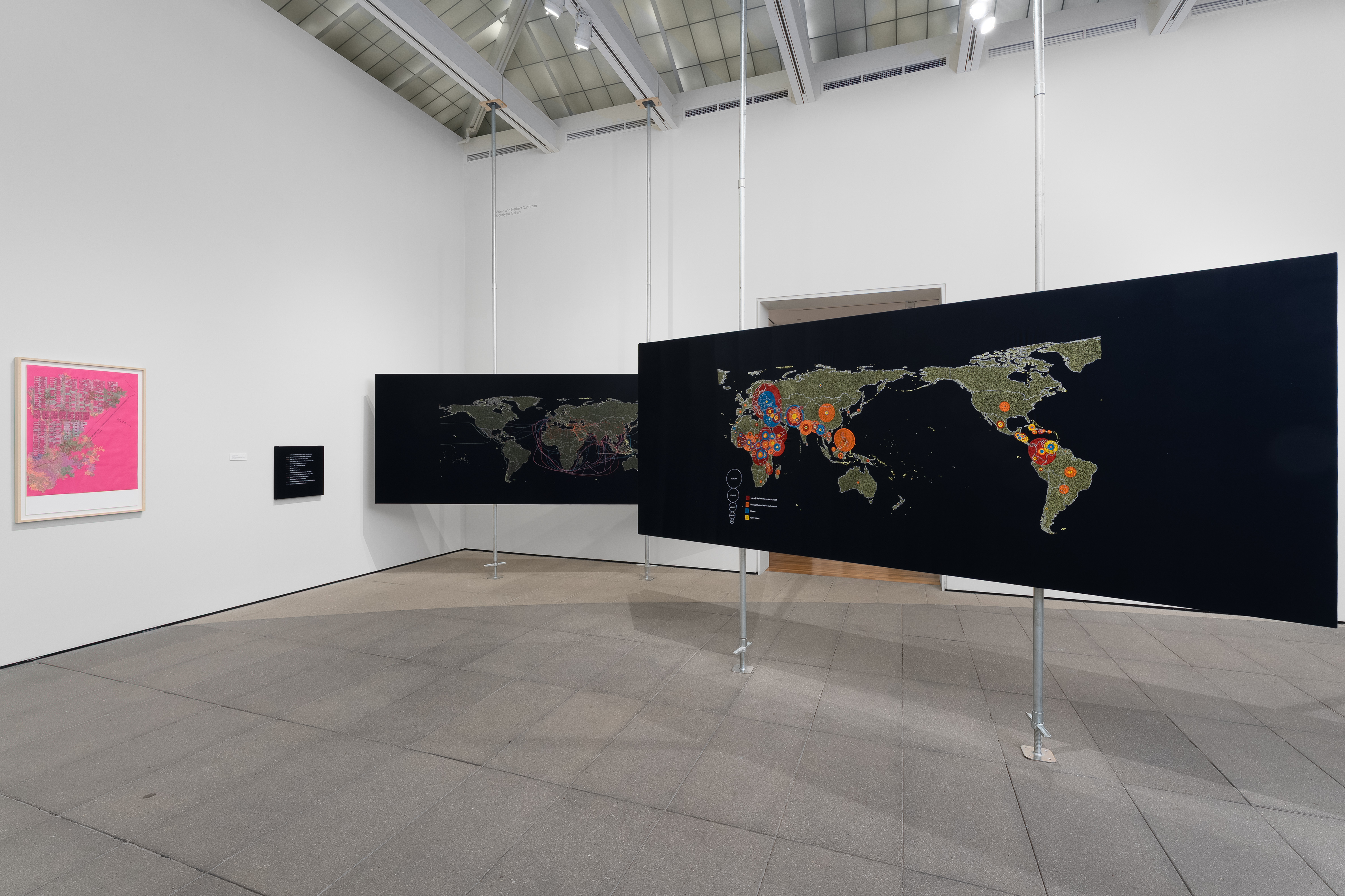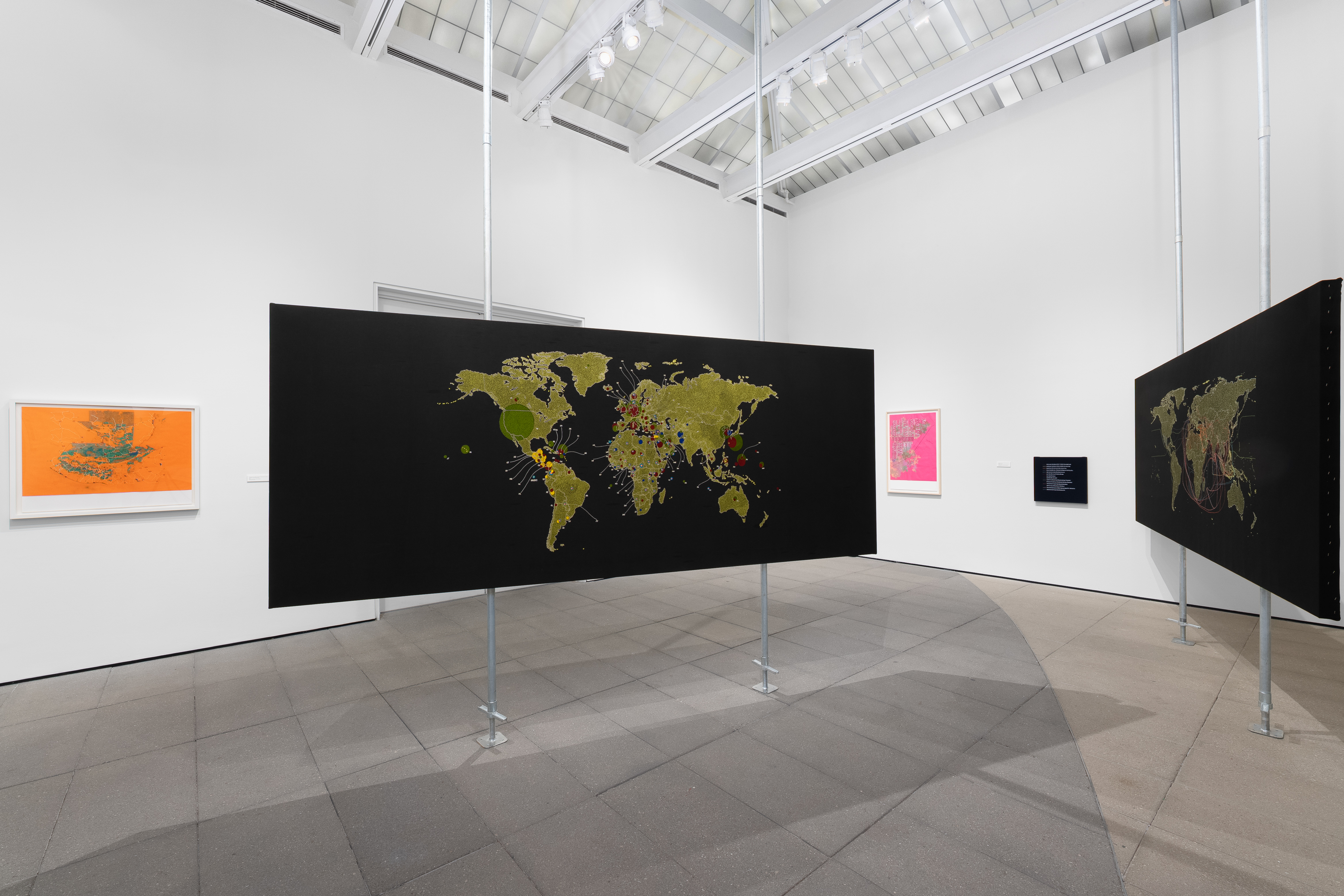 The work USM GLOBAL commissioned by PAFA maps the U.S. military global footprint, with the location and number of their facilities in 125 countries and colonies. There is an accompanying website that has interactive maps and archives Tiffany Chung’s research materials for this mapping project, which puts in focus several regions including countries in Sub-Saharan Africa, Pacific.