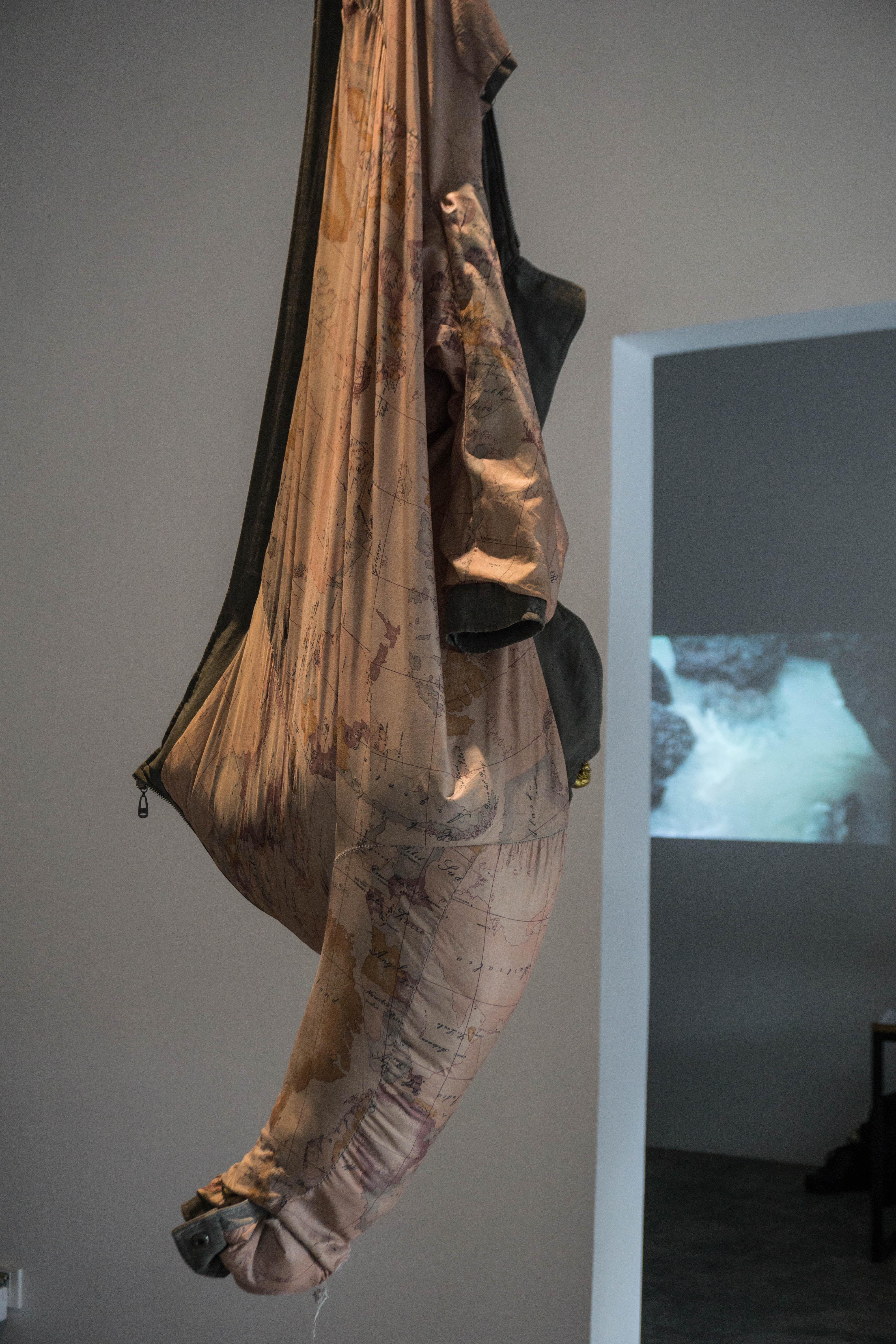 Found jacket with printed world map , ash, iron hooks, belt of agricultural vehicles, cicadas…