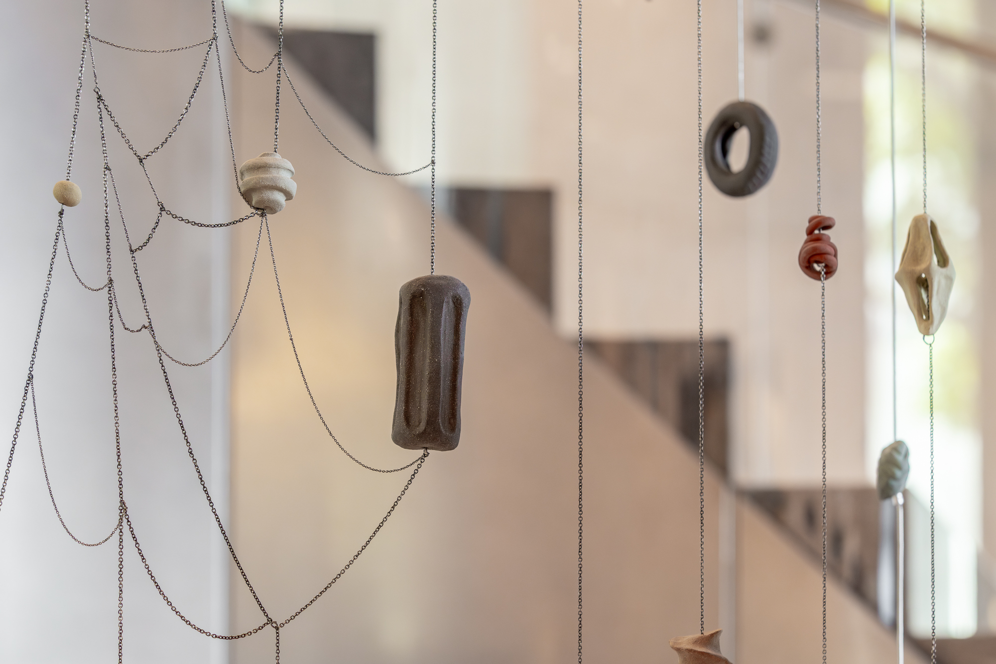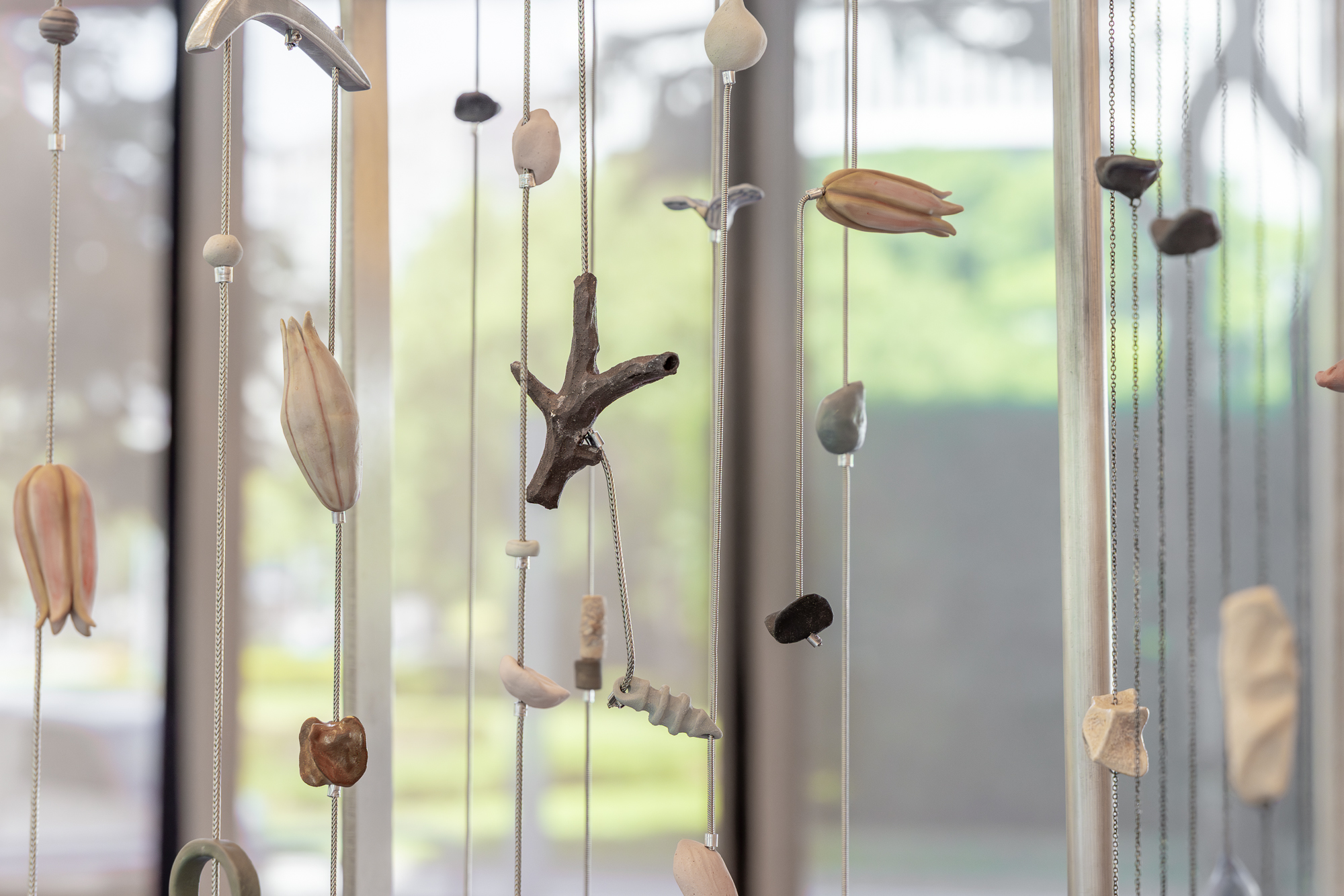 After realising the “Plastonki” exhibition in 2021, Yang has been delving deeper into the physical and emotional characteristics of handcrafted ceramics, suspending an array of ceramic objects in tree structures or vertically, producing motorised wind chimes that spin and ring, and curtains that gradually rise and fall. The recent ceramic installations crystallise different threads of Yang’s practice over the past ten years—an ever-deepening exploration of personal experience, the natural environment, architectural space, memory, sound, ruin, performativity, organic form and non-readymade. Wind chimes have also transformed the gesture of suspension with which Yang has been fascinated for years—she gingerly demonstrated her interest in pendulous movements and suspension in exhibitions such as “Specimen” (2014), “What a Wonderful World” (2017), and in installations such as Nine Lines. Yang’s recent sound-ceramic installation commissioned by the 2023 Taipei Biennial juxtaposes the wind chimes and curtain pieces presented at the solo exhibition “Tuning into Autumn” (2023): the former examines one’s struggle with anxiety and fear, while the latter signifies ways in which one may calmly embrace life. In the landscape of “Tuning into Autumn”, Yang gently encourages visitors to recalibrate their speed, to relive a cadence that aligns with nature, to revisit affection and fondness, and to, ultimately, cultivate a state of tranquility with life, as fallen leaves and seeds.