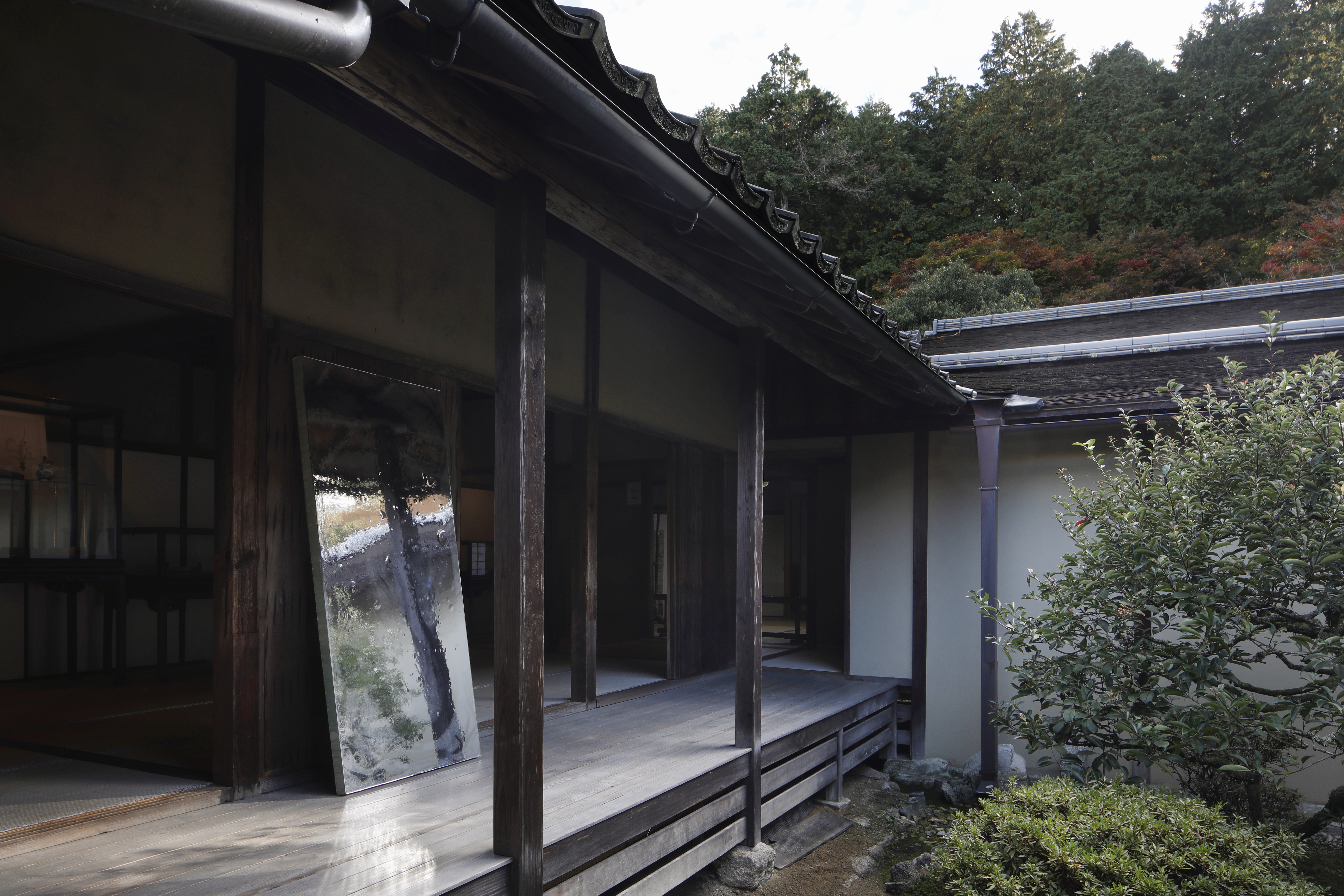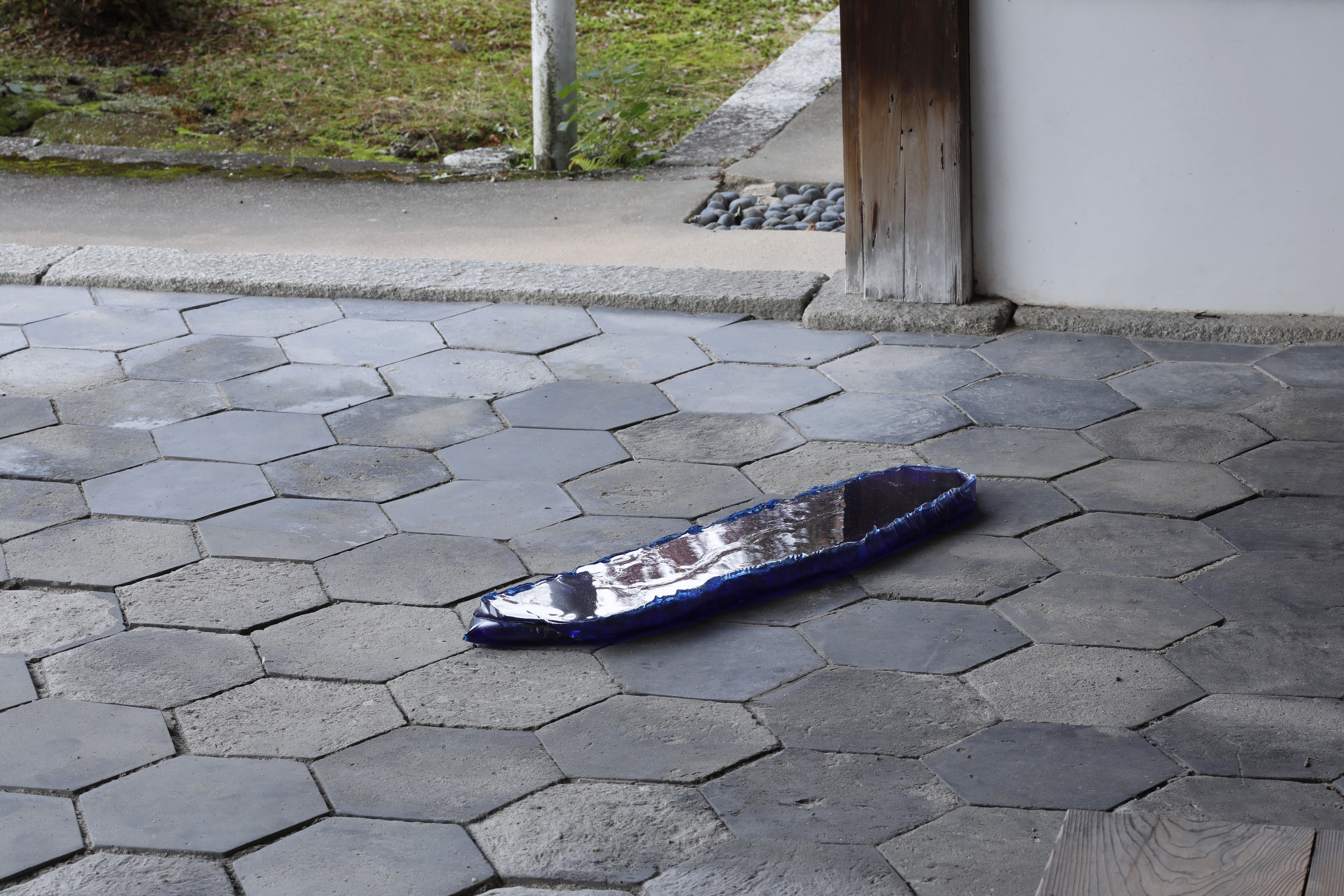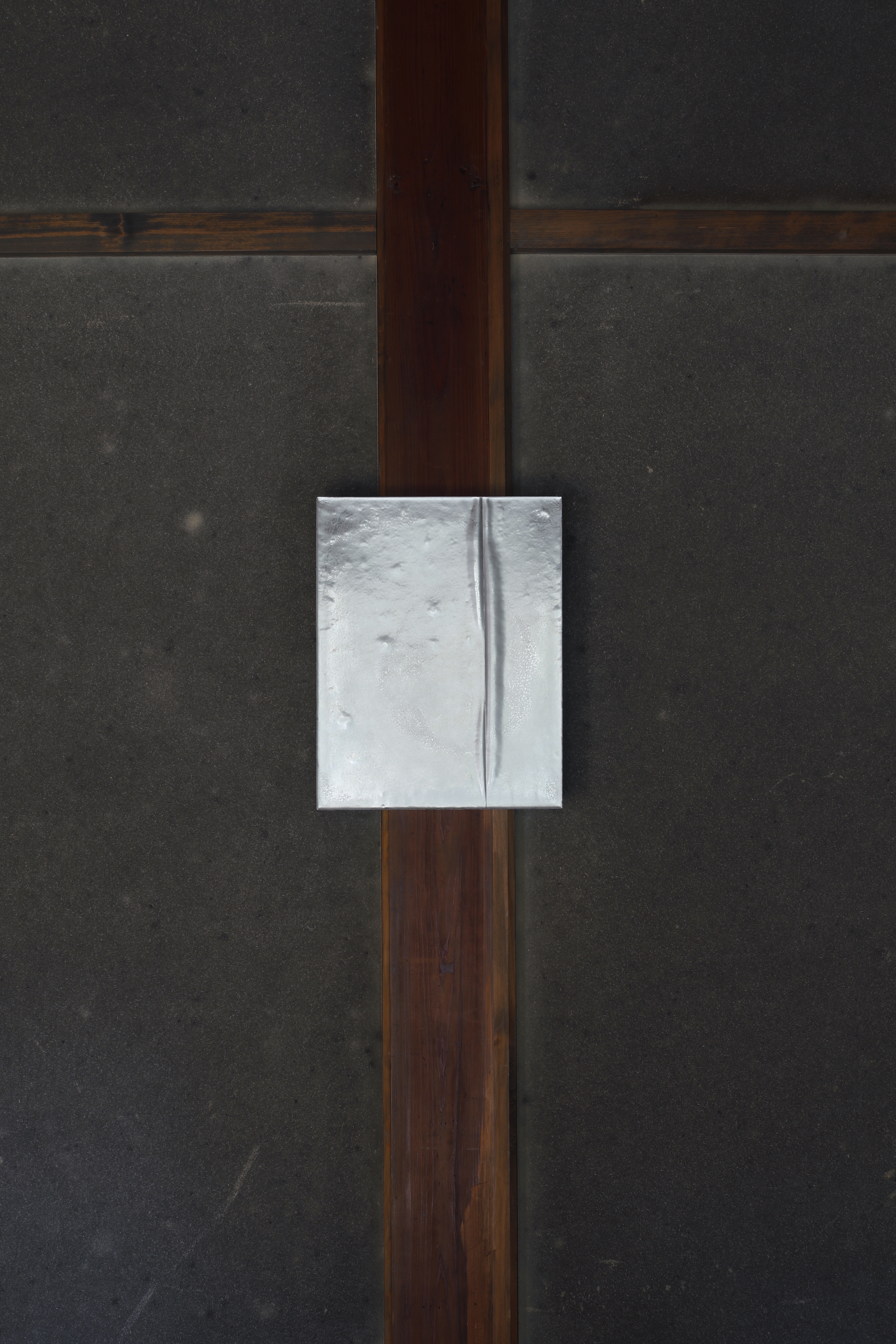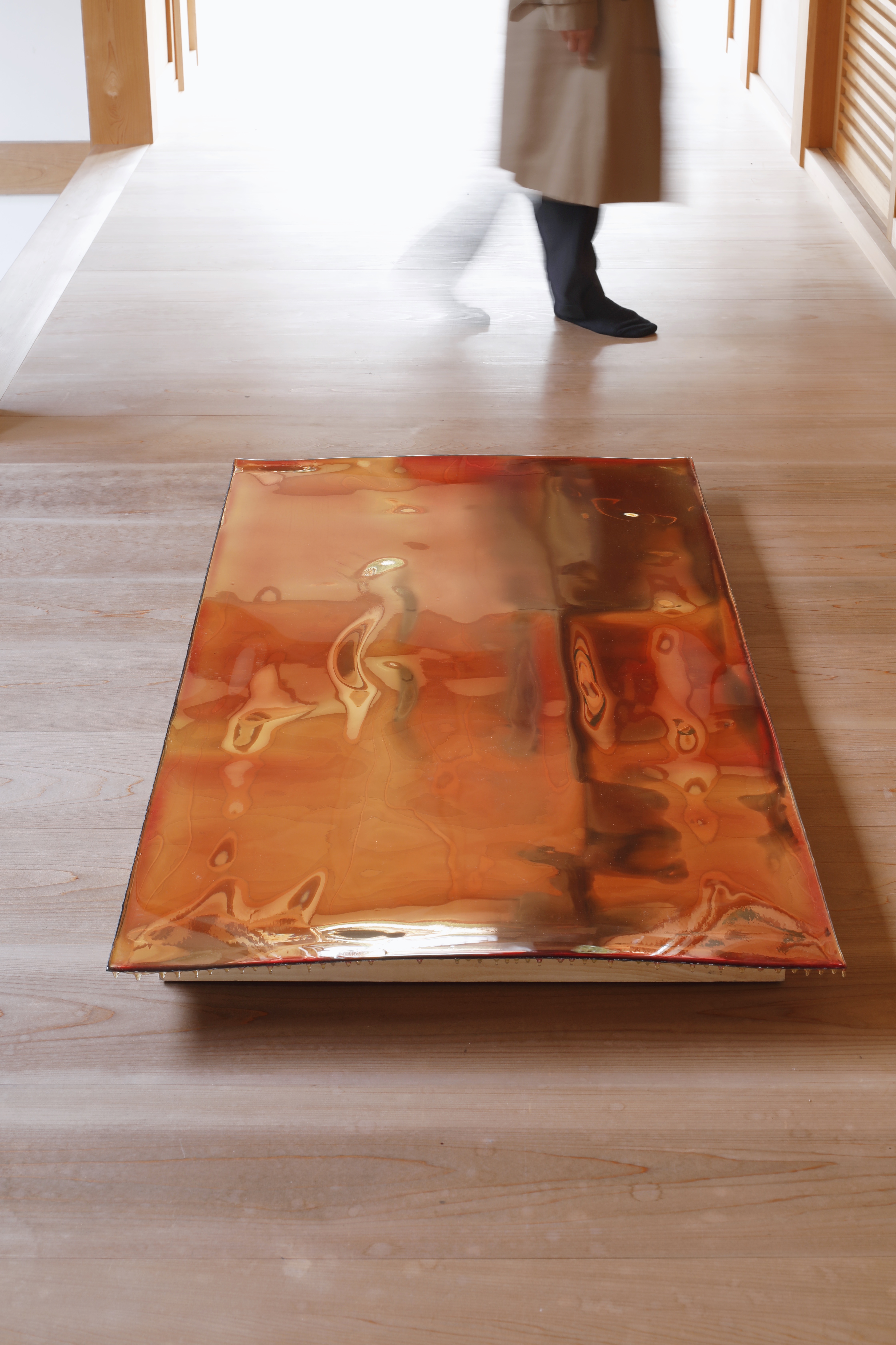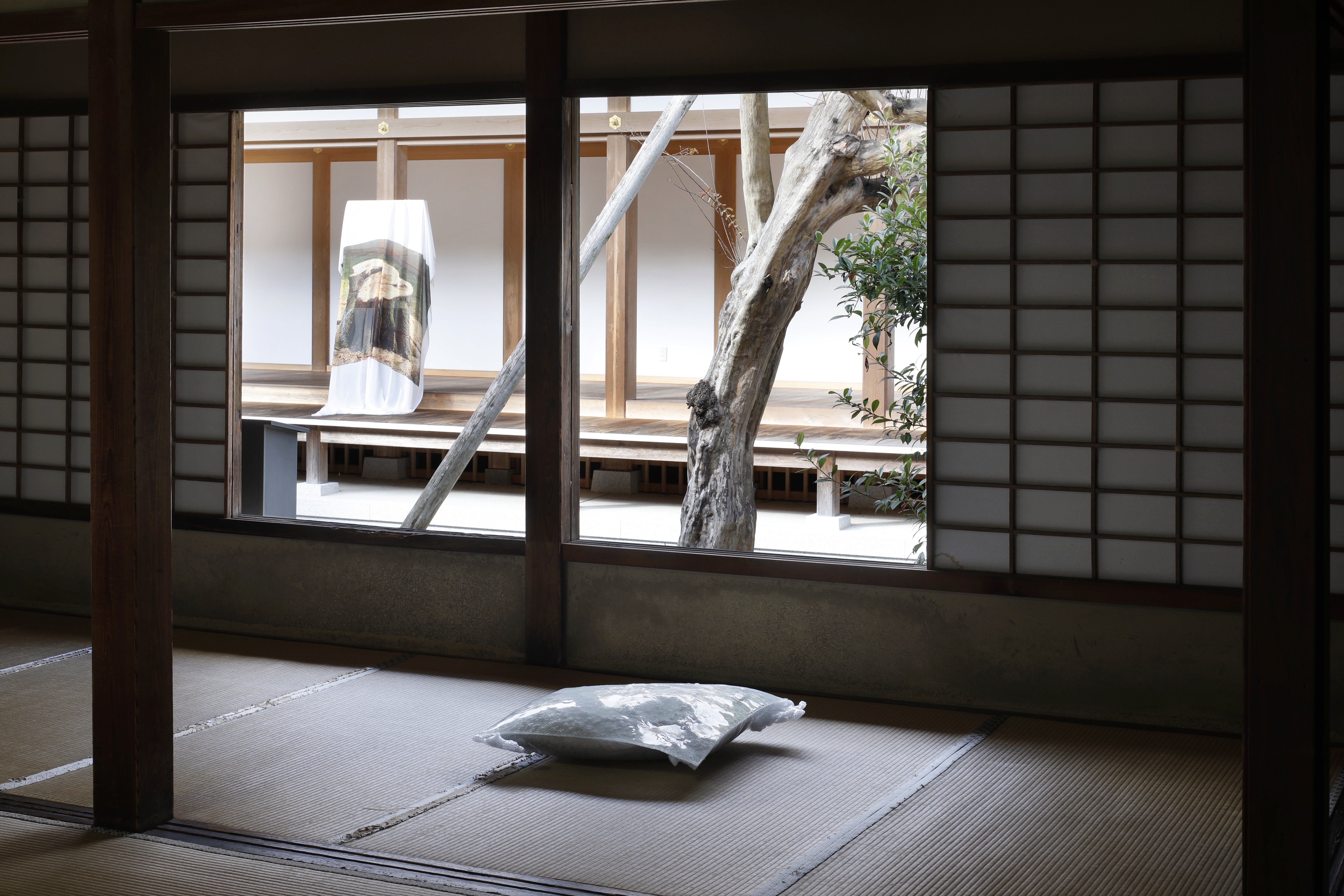 Responding to Manshu-in’s porous spatial boundary between the inside and the outside, Yamaoka guides the viewer by employing the toggling perspectives of looking into and out of, from a distance and close-up. Her works, partially exposed to the elements, catch the intensity of sunlight and shadows at different times of the day, reflect what lies beyond through changing air currents and wind, and coalescing perception with the viewer’s internal rhythm.