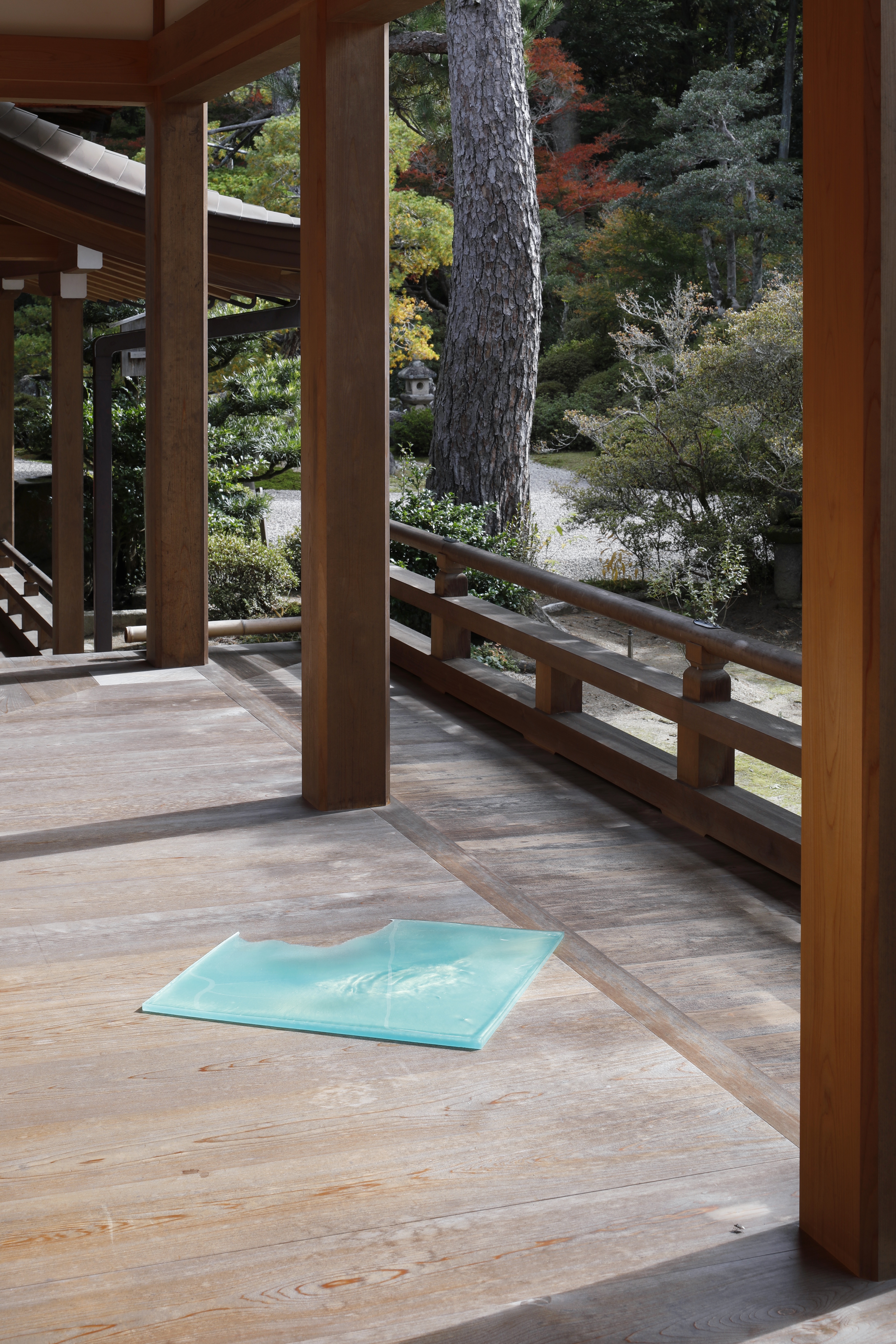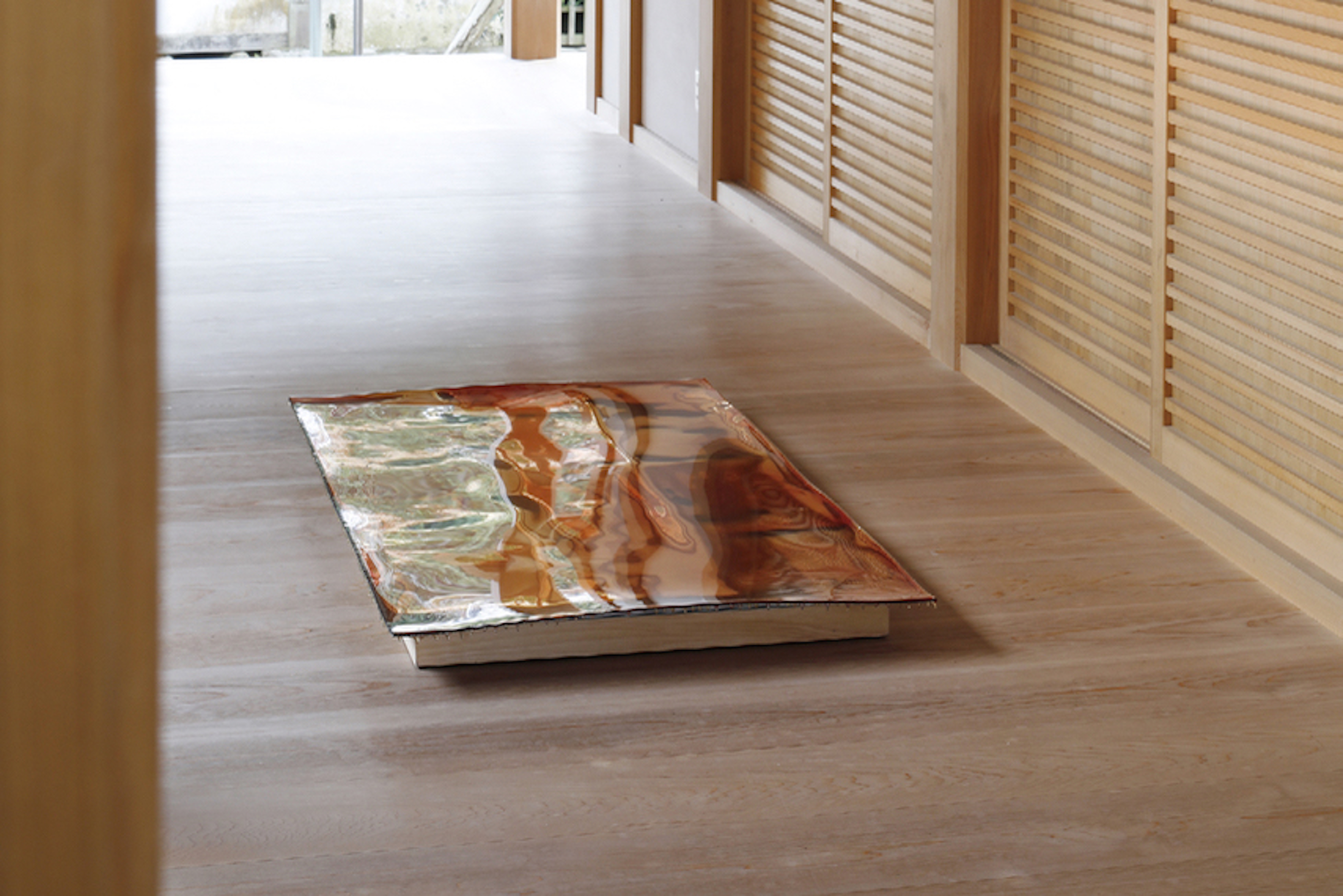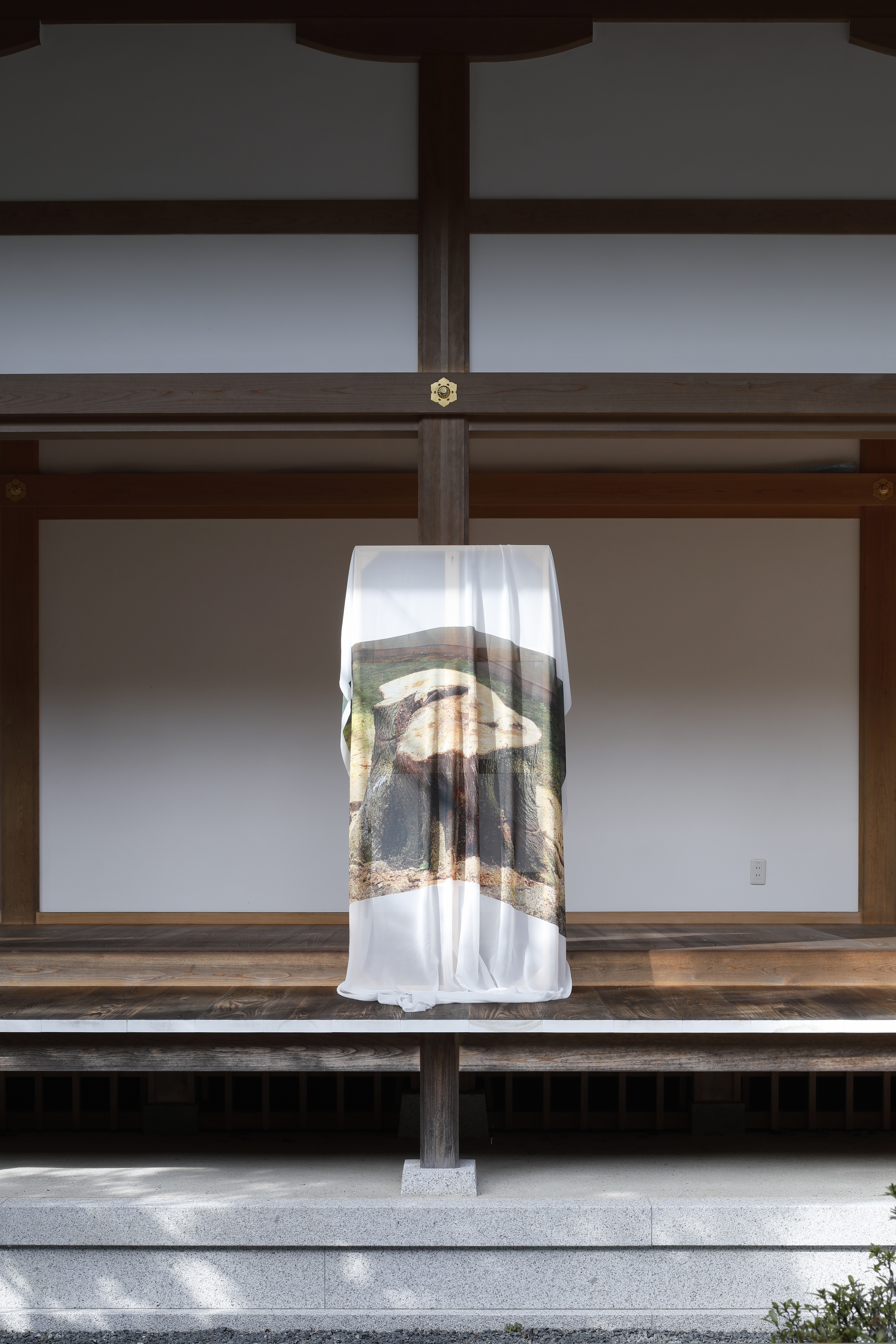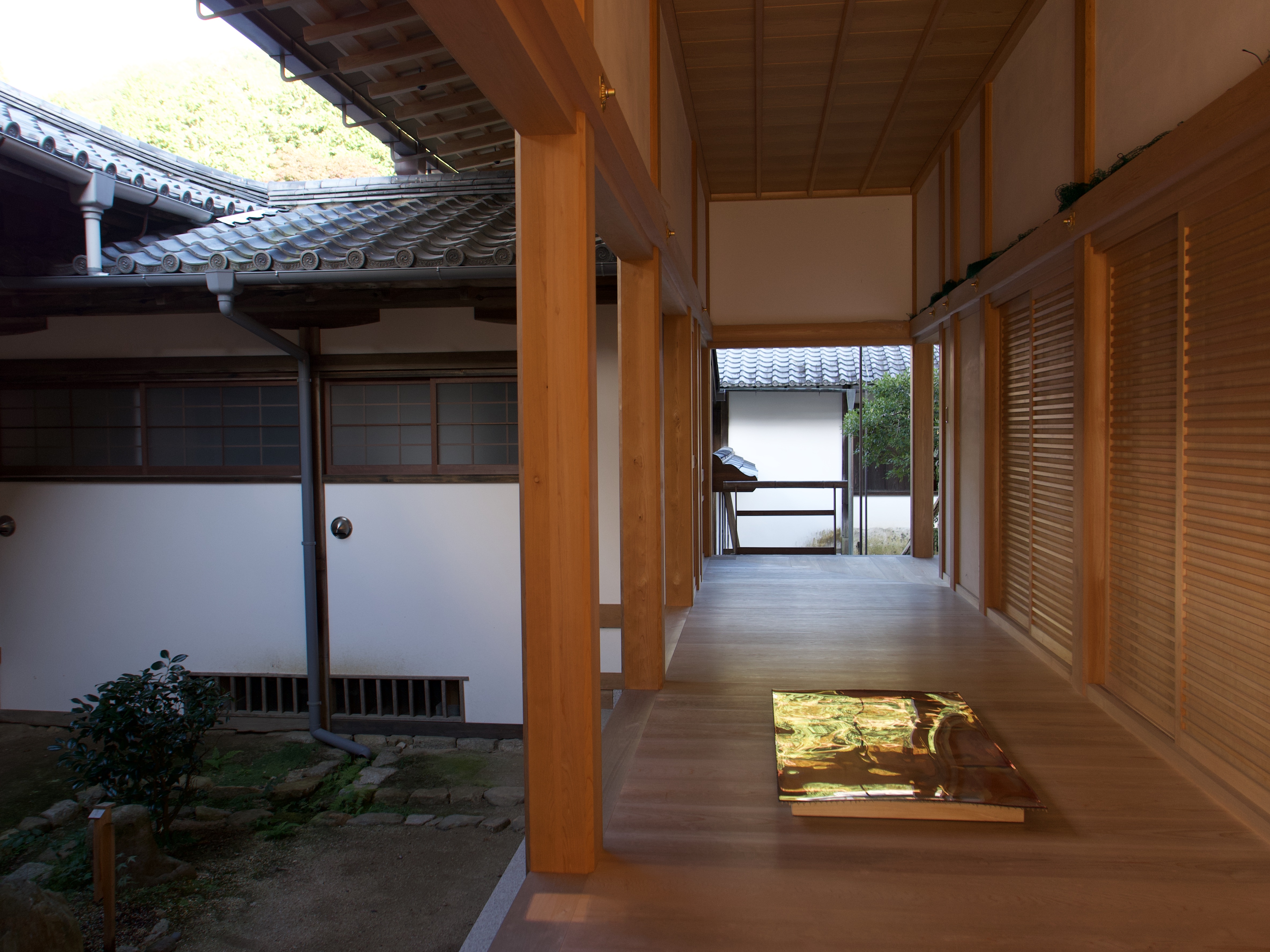 Responding to Manshu-in’s porous spatial boundary between the inside and the outside, Yamaoka guides the viewer by employing the toggling perspectives of looking into and out of, from a distance and close-up. Her works, partially exposed to the elements, catch the intensity of sunlight and shadows at different times of the day, reflect what lies beyond through changing air currents and wind, and coalescing perception with the viewer’s internal rhythm.