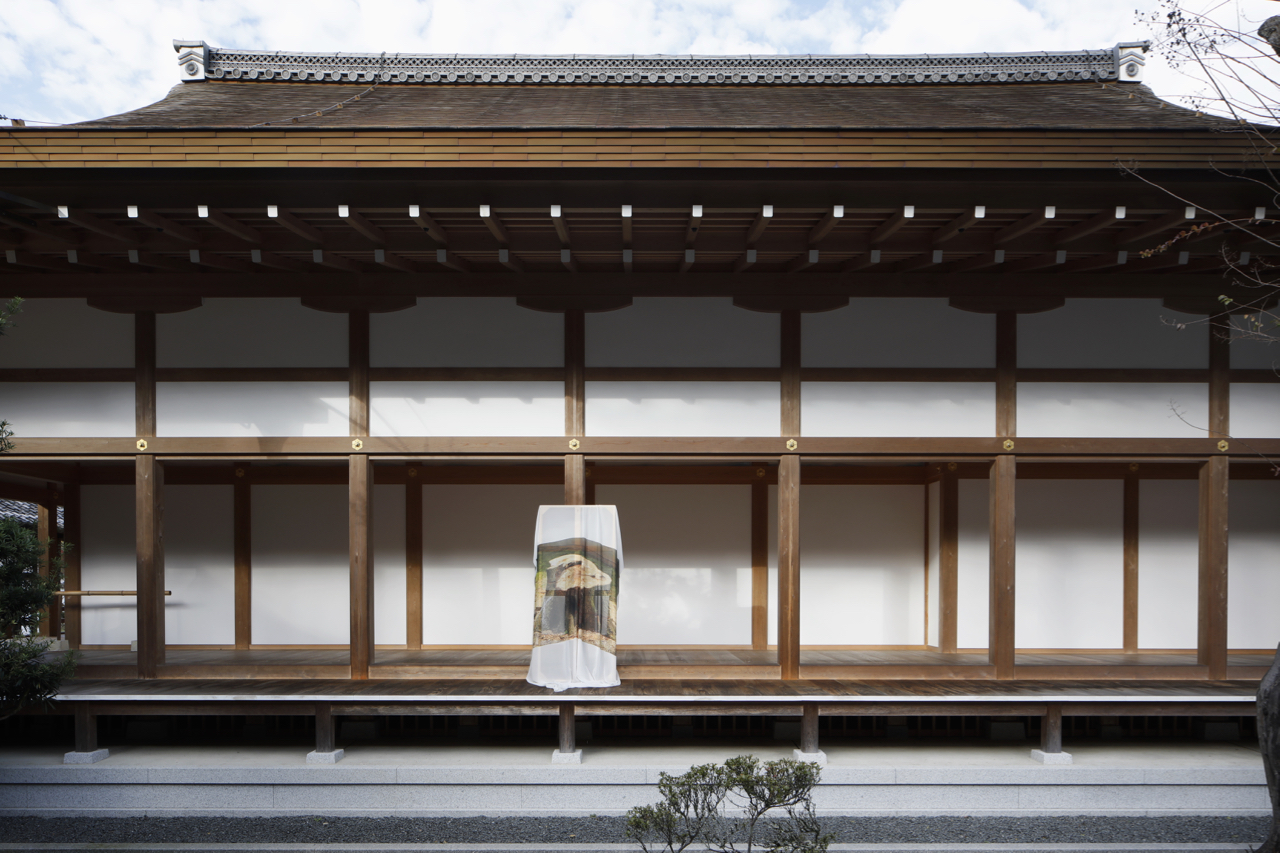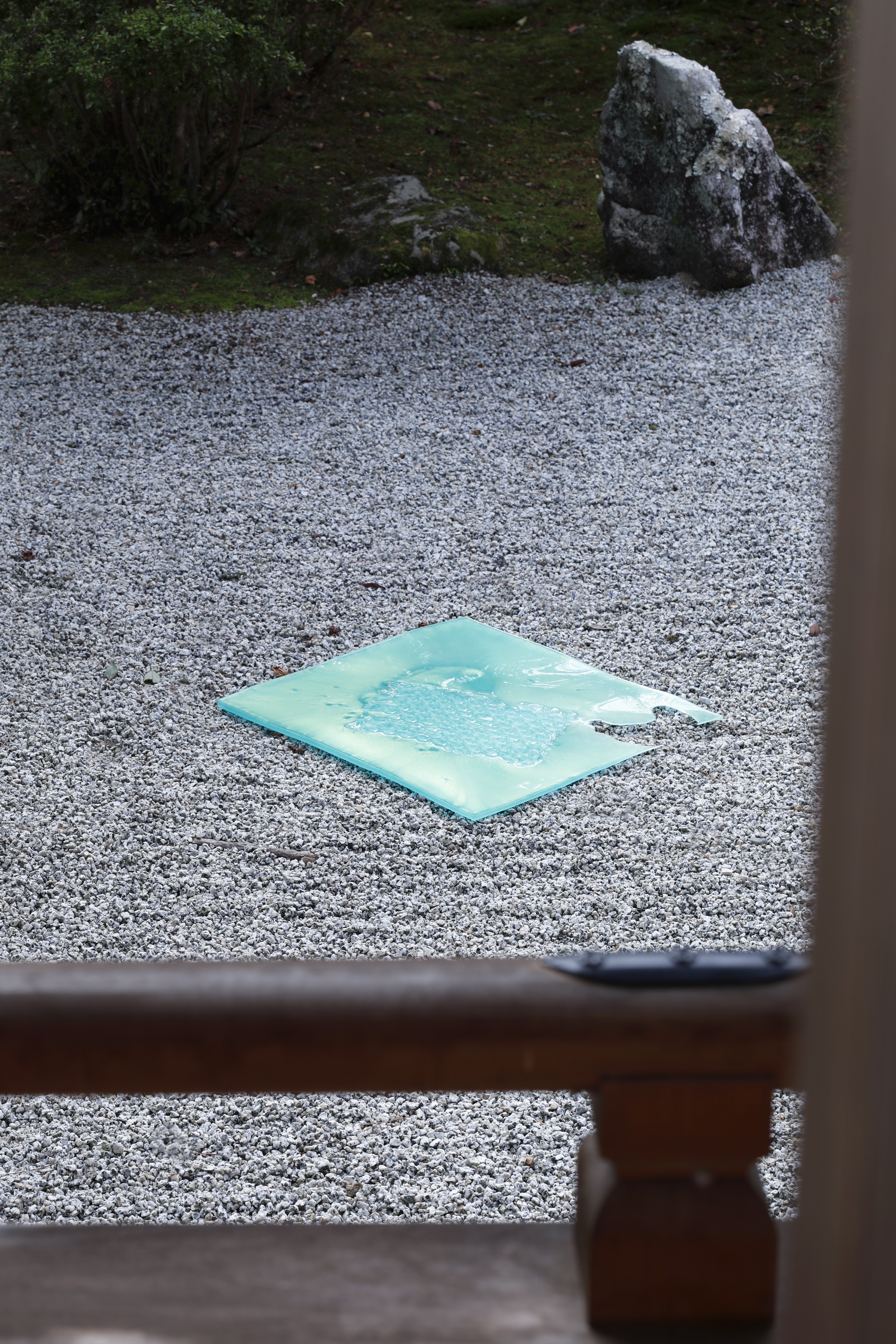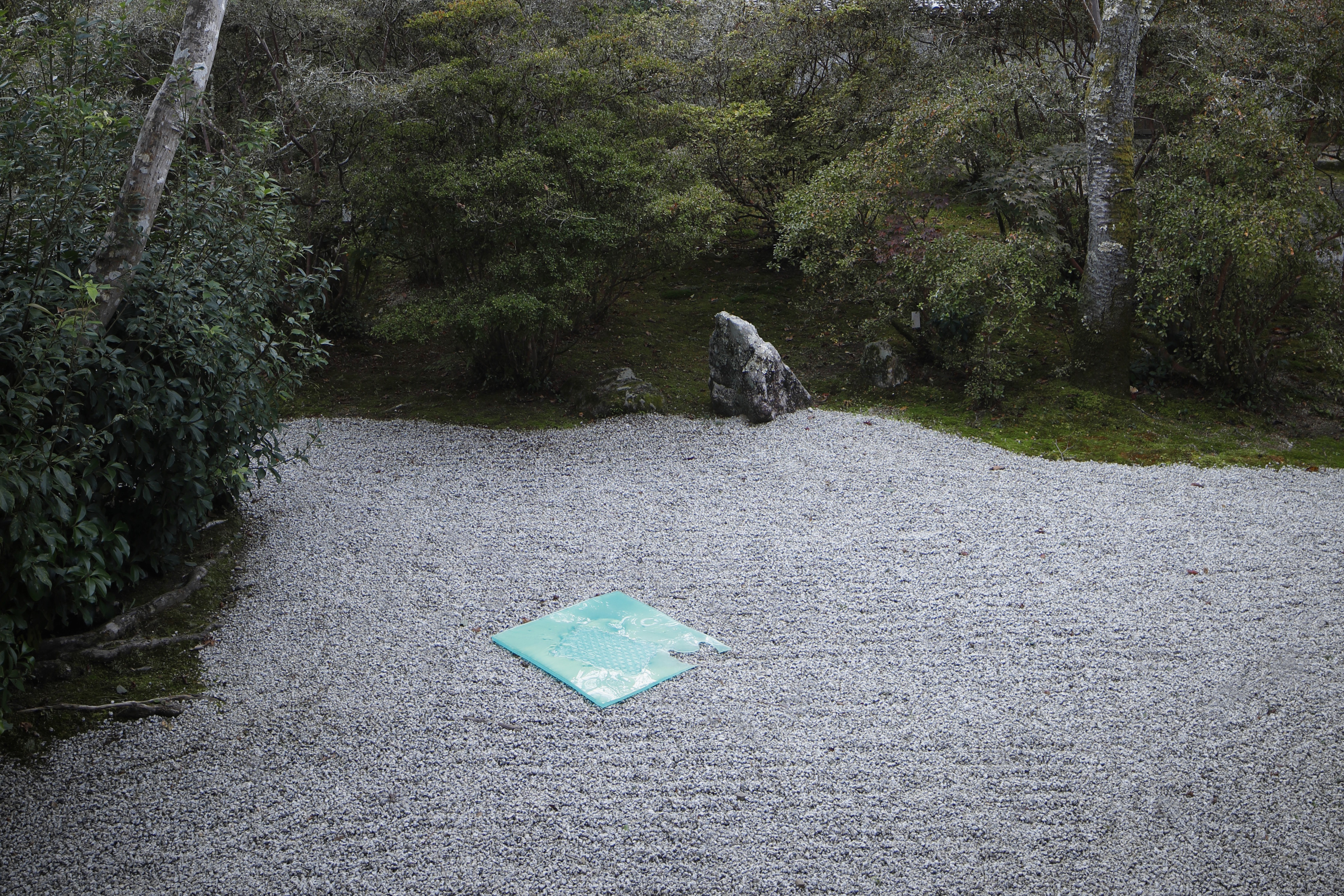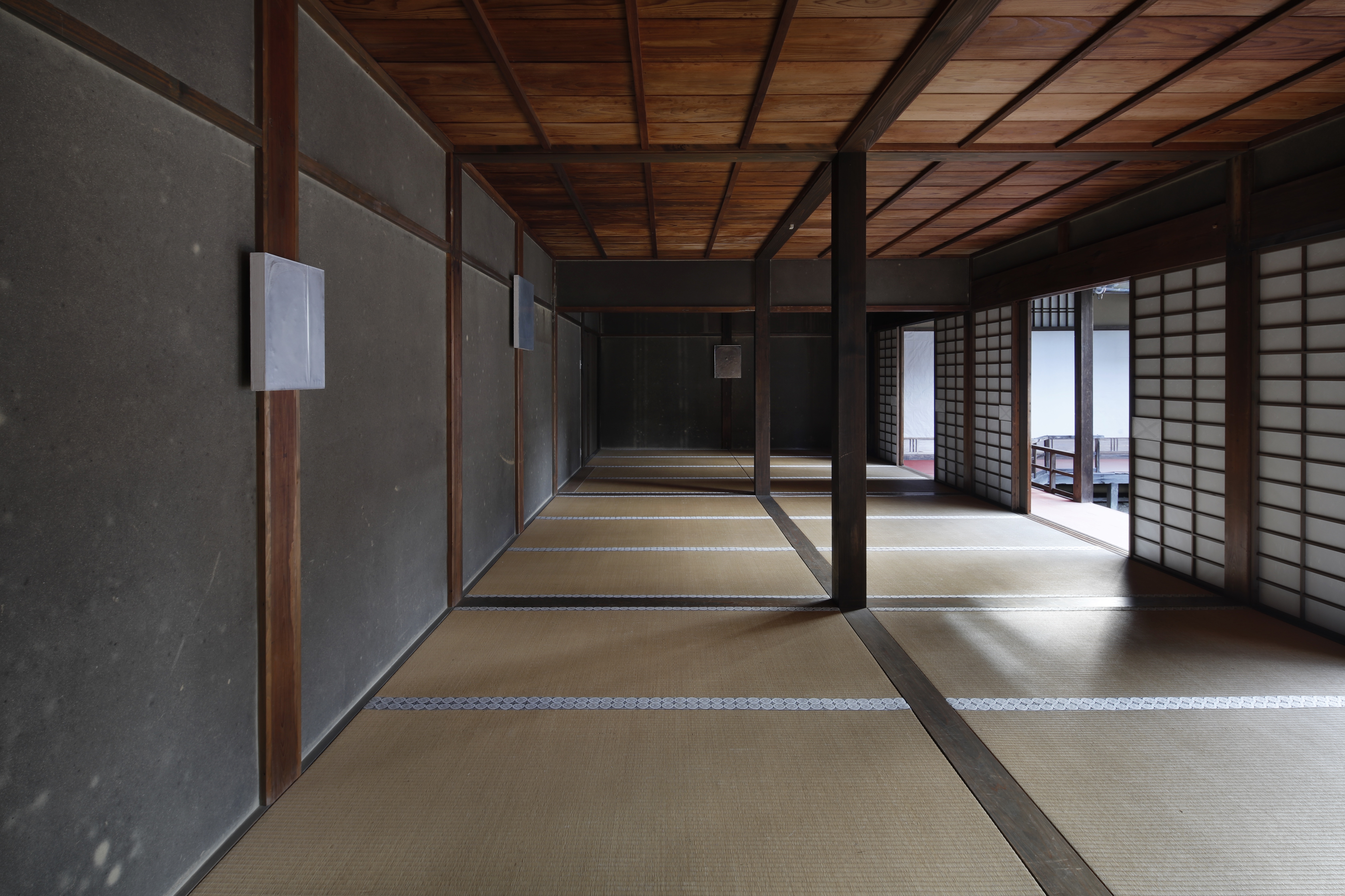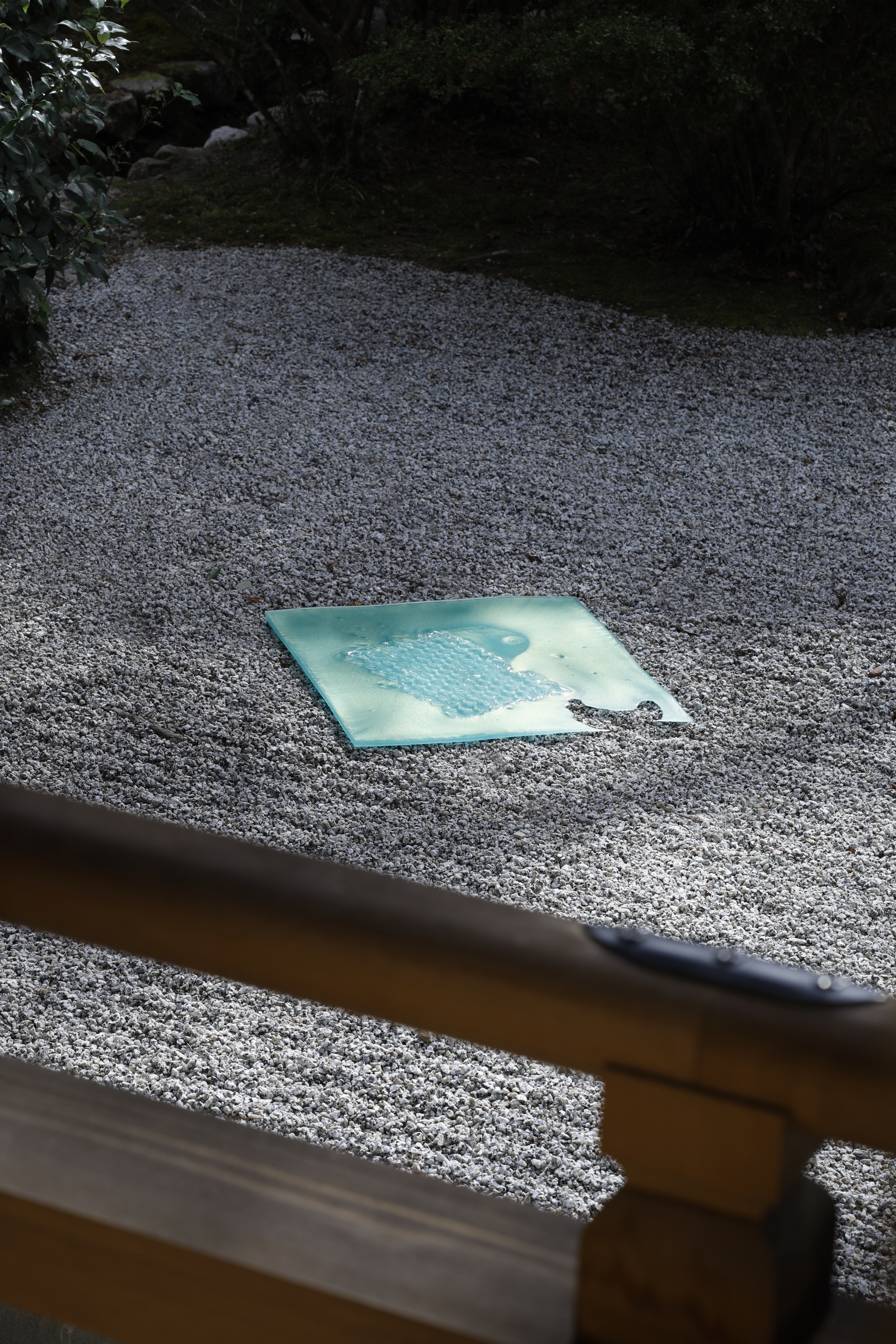 Responding to Manshu-in’s porous spatial boundary between the inside and the outside, Yamaoka guides the viewer by employing the toggling perspectives of looking into and out of, from a distance and close-up. Her works, partially exposed to the elements, catch the intensity of sunlight and shadows at different times of the day, reflect what lies beyond through changing air currents and wind, and coalescing perception with the viewer’s internal rhythm.