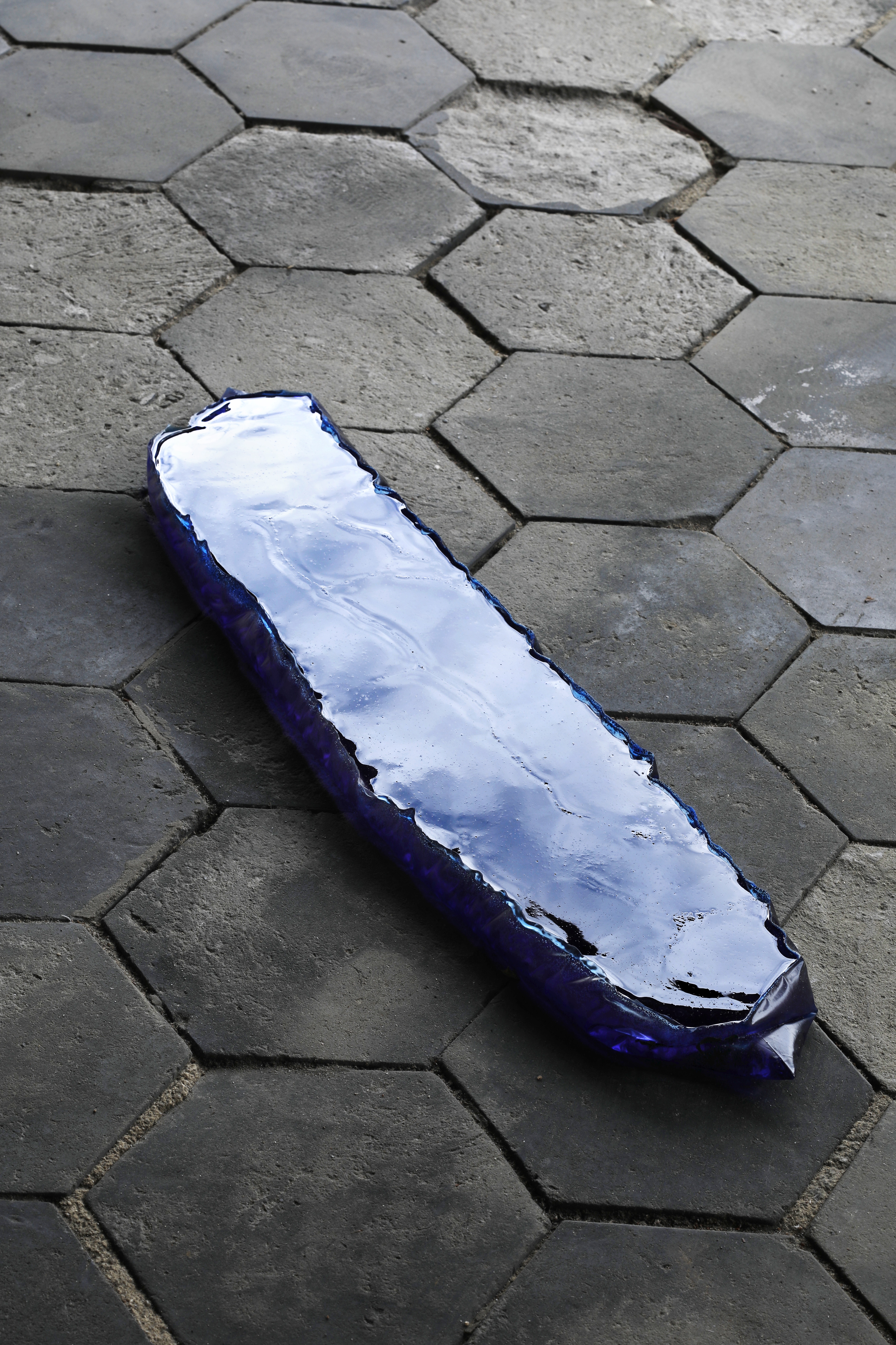Installation view of Carrie Yamaoka, Cast bag (blue), 2025. Cast urethane resin and mixed media, 82.5 x 20.3 x 5.1 cm; 32 ½ x 8 x 2 in