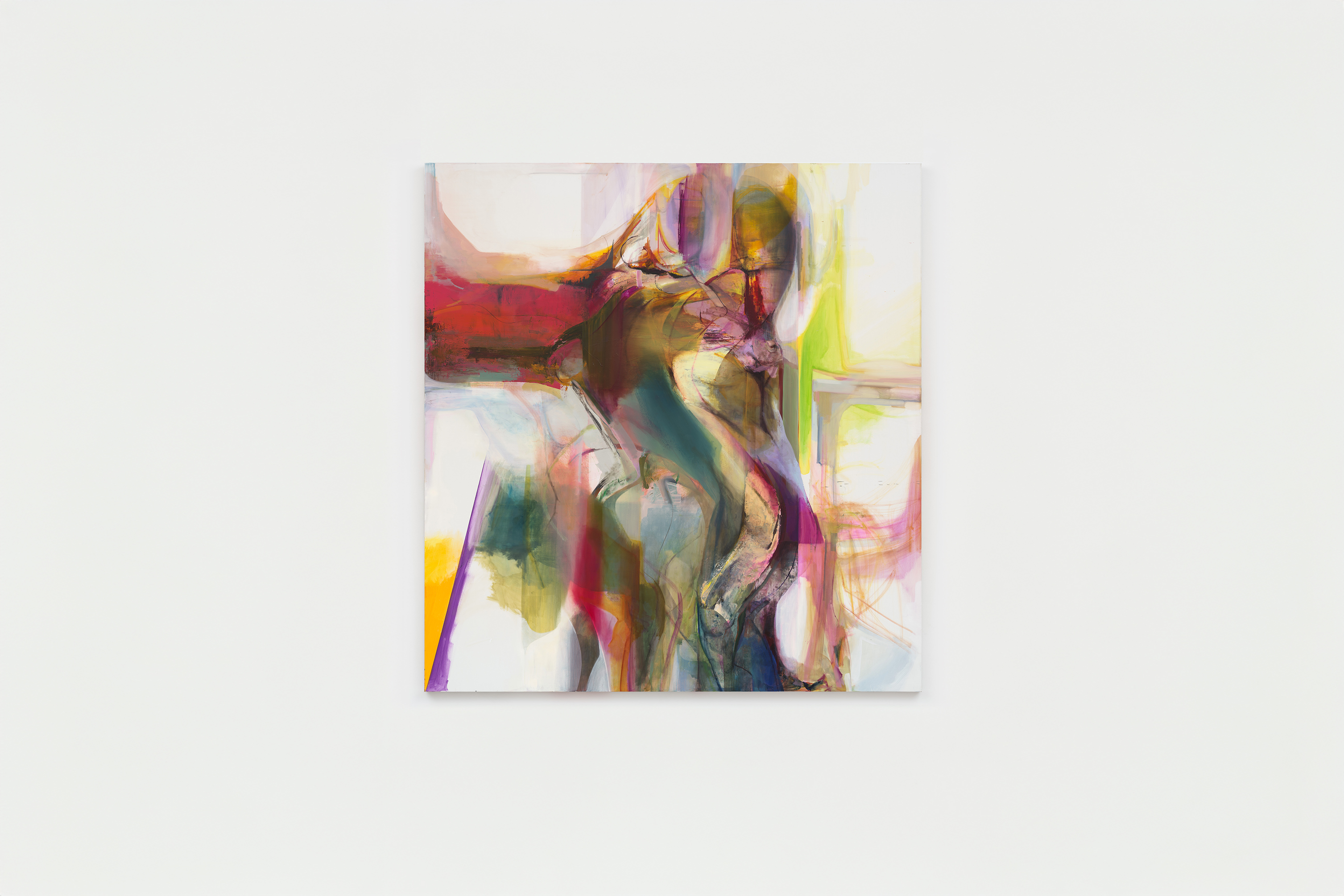 You, Girl (2025) takes as its point of departure Italian Mannerist painter Bronzino’s An Allegory with Venus and Cupid, transforming a figure borne aloft by angels into a highly abstract contour, before rendering its body and movements substantially physical. The composition of pale, irregularly shaped lights flooding through from different impossible sources, effectively penetrating the central figure, is counterbalanced by the remarkably dense textures over the translucent body, turning this intangible corpus into an amalgamation of traces and marks.