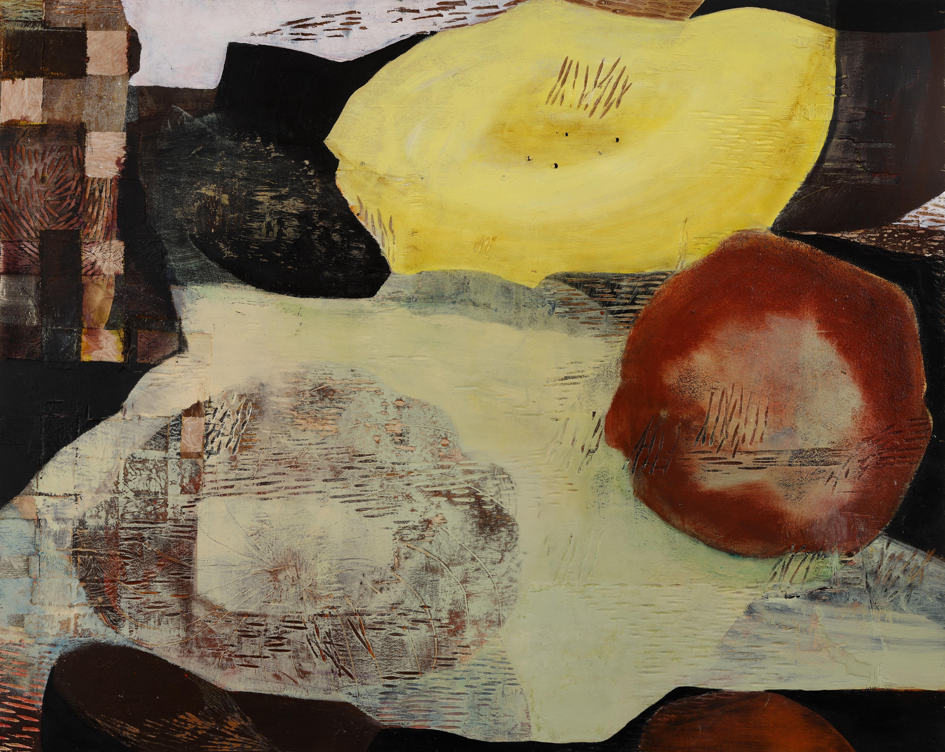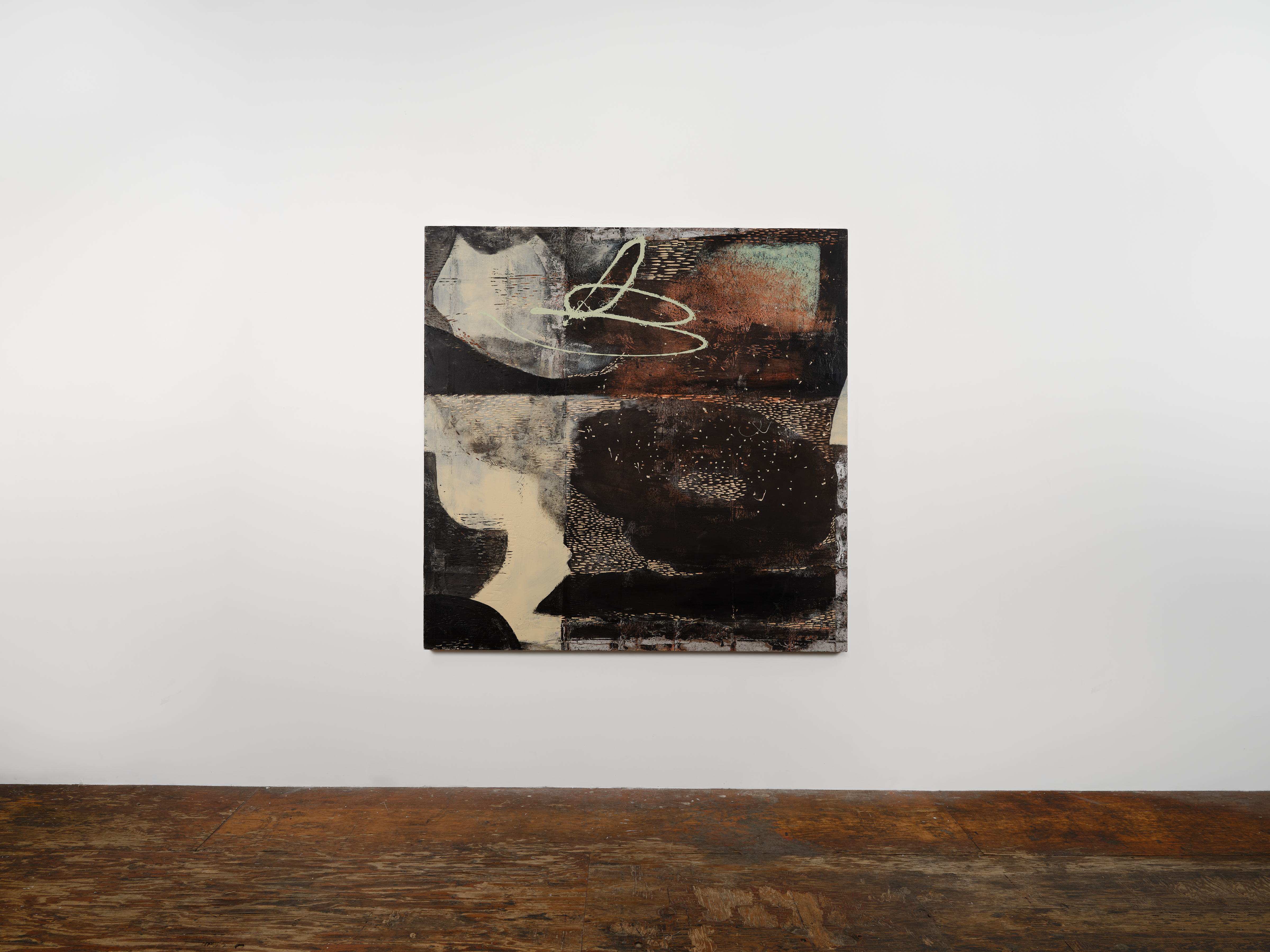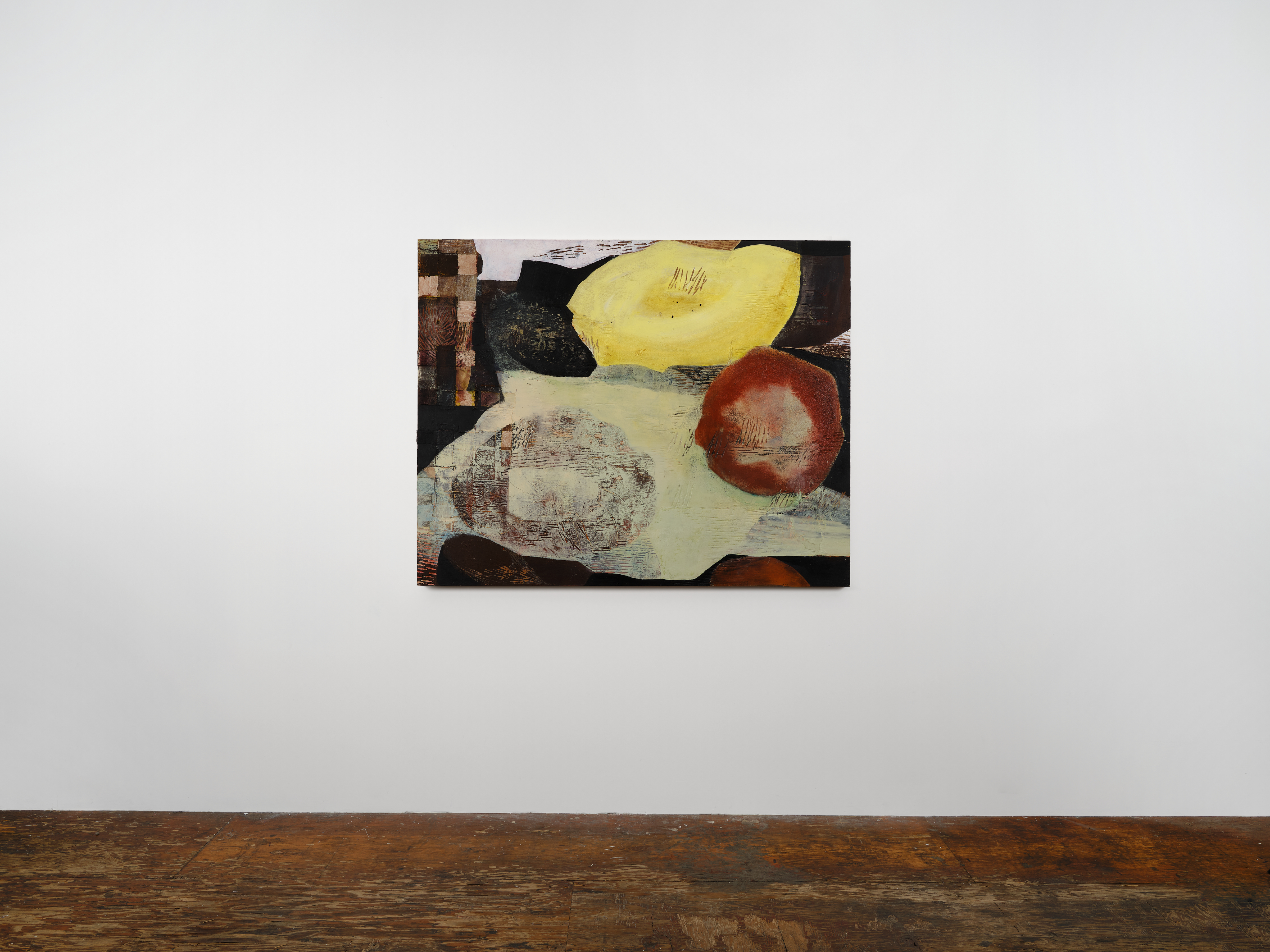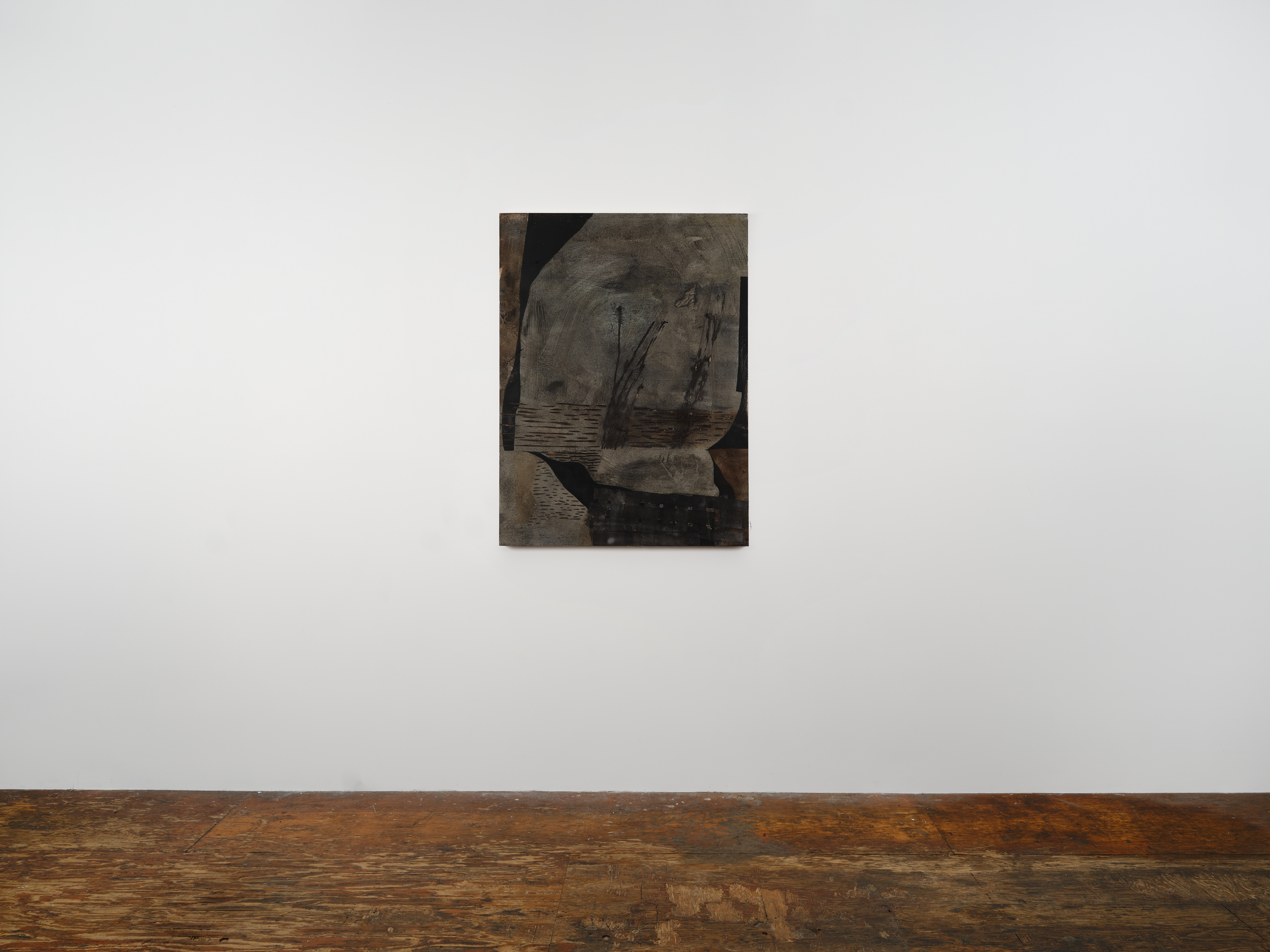 In A Trickle in the Channel, 2026, carved on luan, the horizontal and vertical marks conjure a cartography of waterways and signs of reedy plant life. Recalcitrant to narrative, it holds within it a sense of place, as in a cut-away filmic shot, an intermediary, for things to come. Varying shades of black and grey in tempera and pigment, suffused with rust-like color, forge an unstable spatial relationship, further complicated by the rapprochement or encroachment of a woven rayon fragment on the lower right. Khôra, 2026, alludes to Plato’s philosophical concept of an interval space, a formless container that generates all things, a receptacle / recipient / receiver that he describes in Timaeus as the “nurse of all becoming.” Faria holds in suspension this sense of latency, by carving into mahogany, sanding its surfaces, embedding woven rayon, and applying pigment, fabric dye, acrylic, and marble dust. Emerging are overlapping, floating forms of radiating voids, perhaps flower or wound blooms that persist, or they could be objects for transmissions, time-space portals, or parabolic antennas. Each form is shaped by its contact with the others, sharing a space, locking in an embrace, within an expanding energy field.