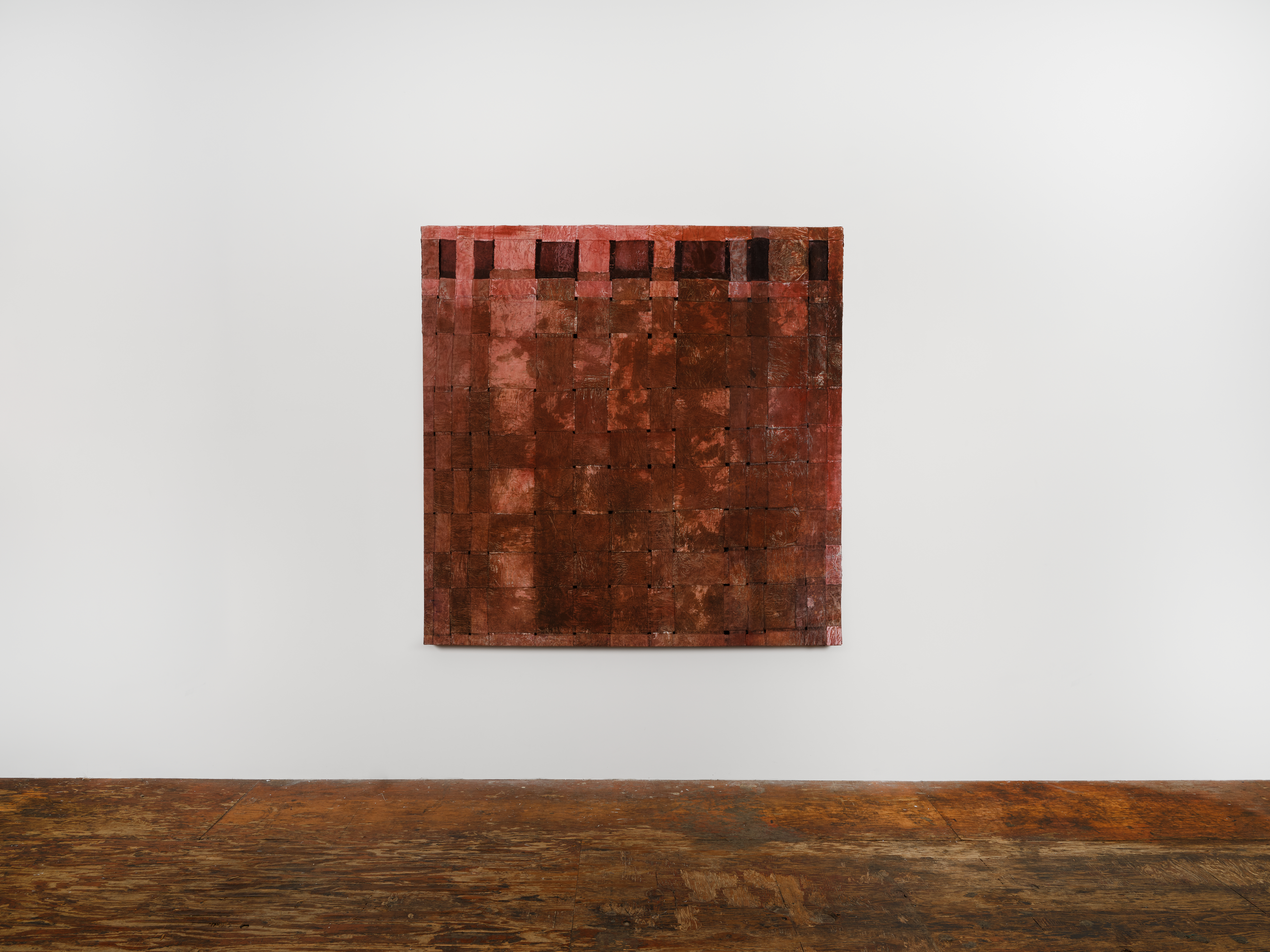 Civil Dawn, 2026. Brazilwood and sumac dyed silk, ink, rayon, adhesive compound, 72 x 72 in; 182.9 x 182.9 cm