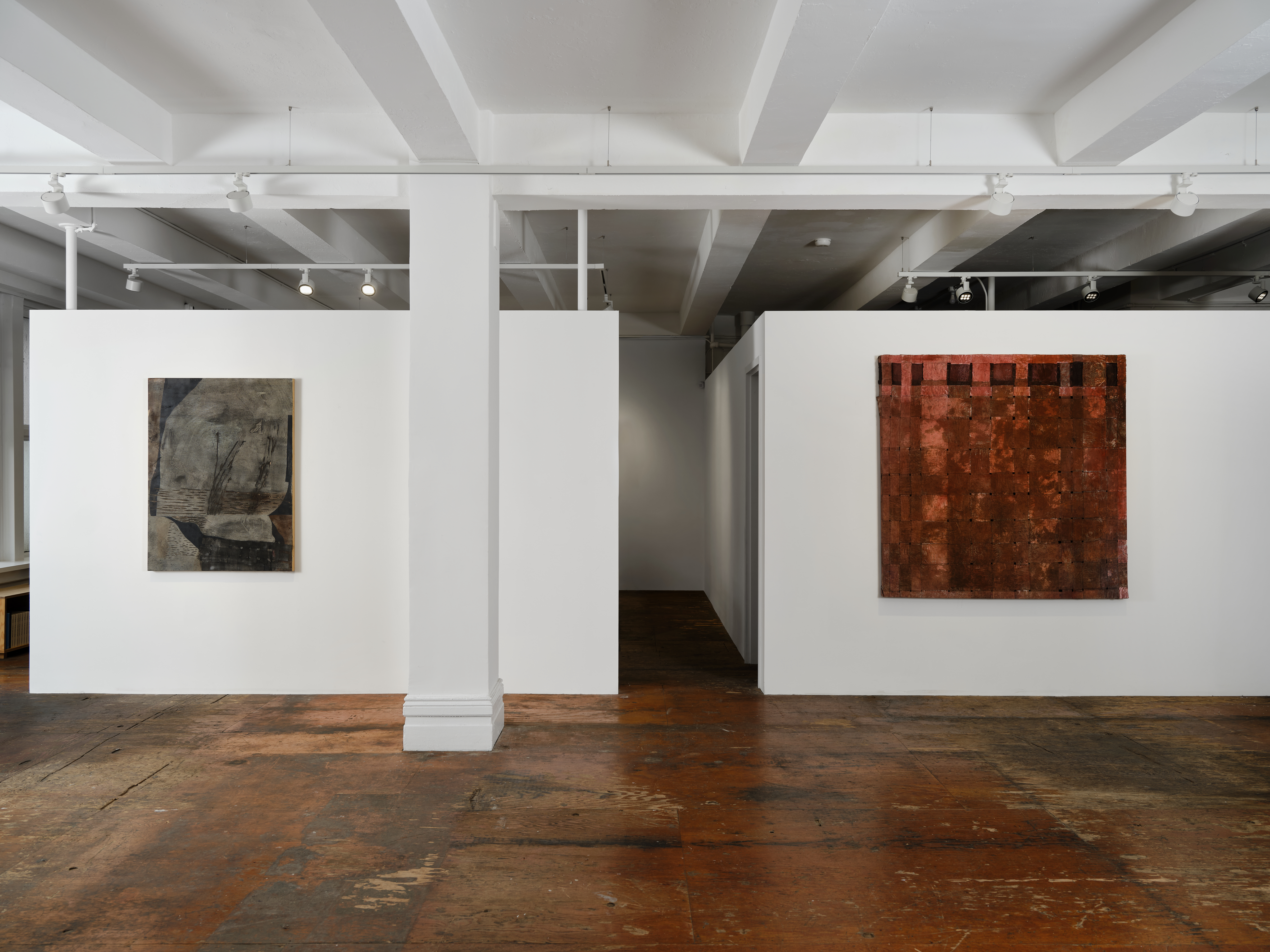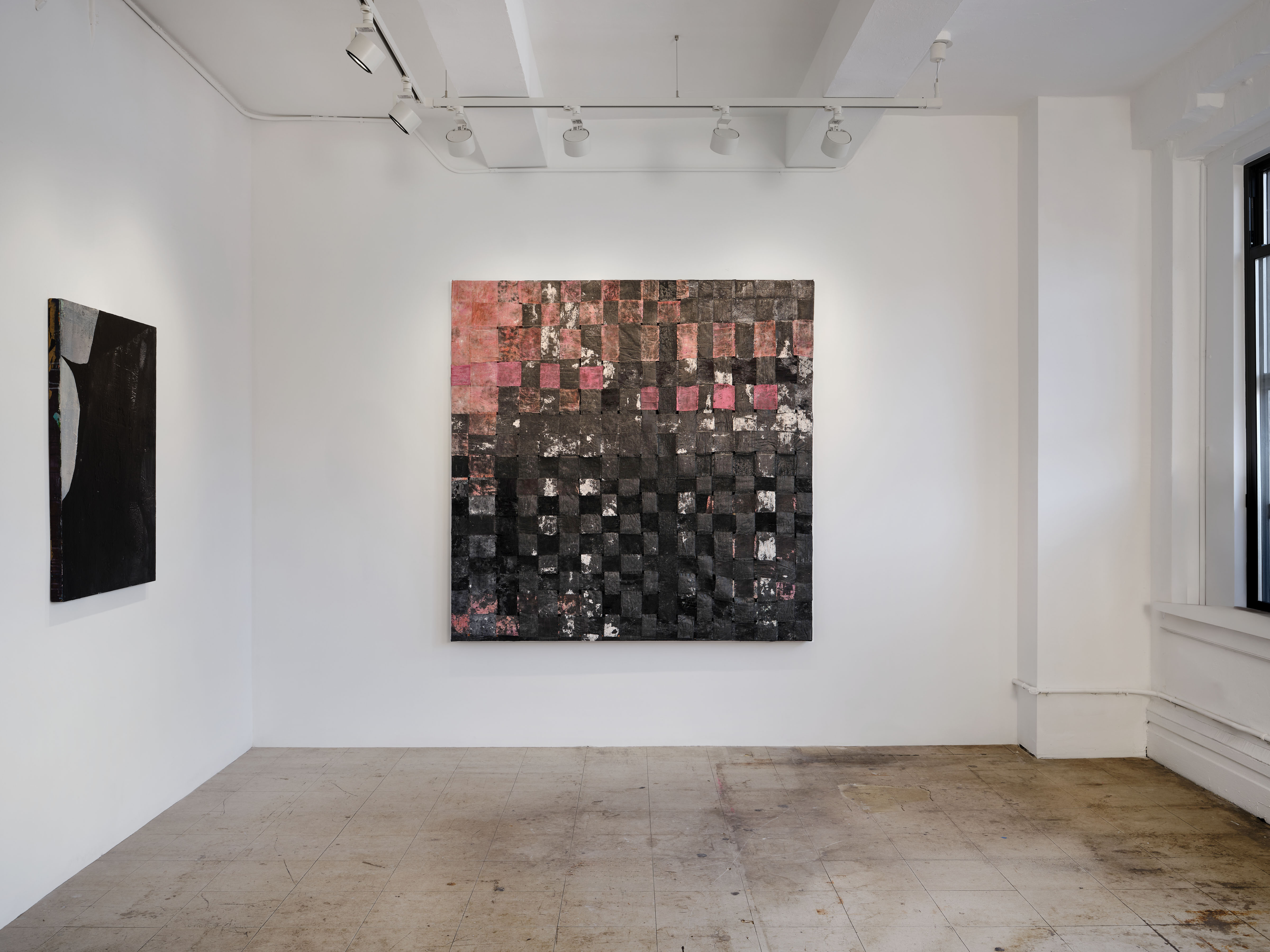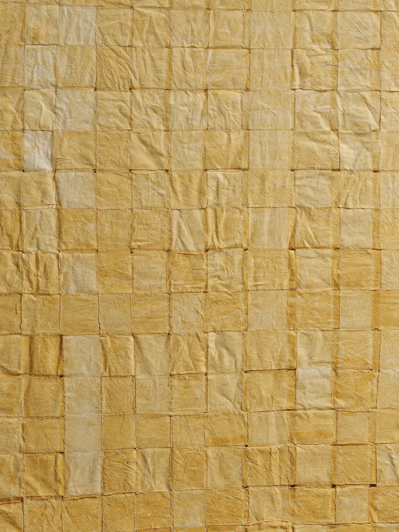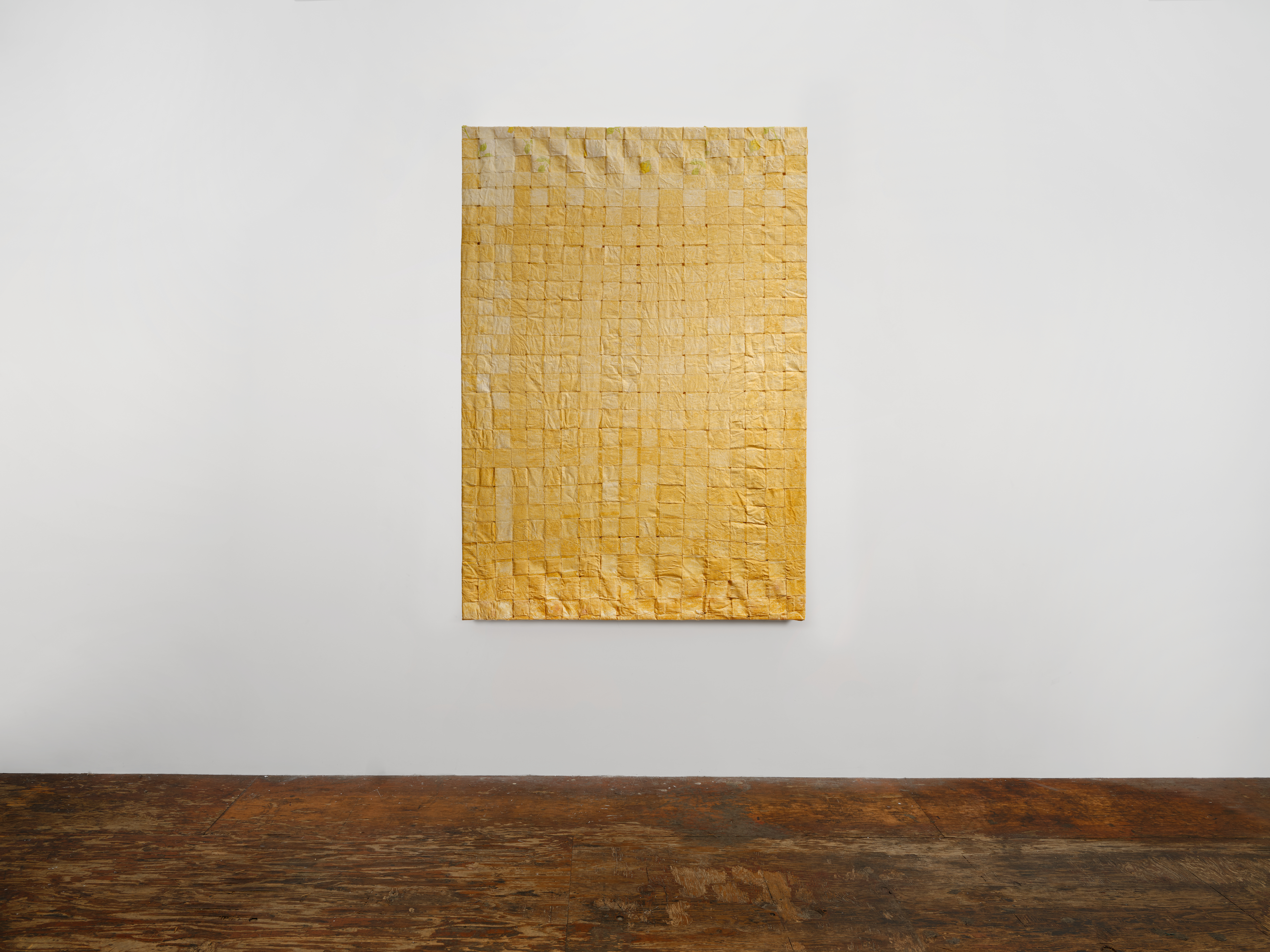 In a series of sculptural paintings, Faria weaves loose grid-like forms using varying widths of different textile materials. Rayon, a semi-synthetic fiber made by regenerating cellulose extracted from wood pulp, interweaves with a personal archive of fabric, many gifted to the artist, such as cotton bedsheets, sari, organza, carried for years from place to place, home to home. Rayon is chosen as it occupies a middle ground between the natural and the synthetic, containing a tension between its origin and its transformation in its ability to mimic silk, cotton, and linen. Its production can contribute to deforestation, air pollution, and waste water when wood pulp is sourced unsustainably. Dipped in pigment, water, glue, and laid flat to dry and shown on its recto, these works of woven grids contain gaps that seem to contend with their own structural integrity. Actively involving the body to produce the warp and weft of weaving, these provisional bonds undo linear time towards fragmentation, cycles, and dilation.