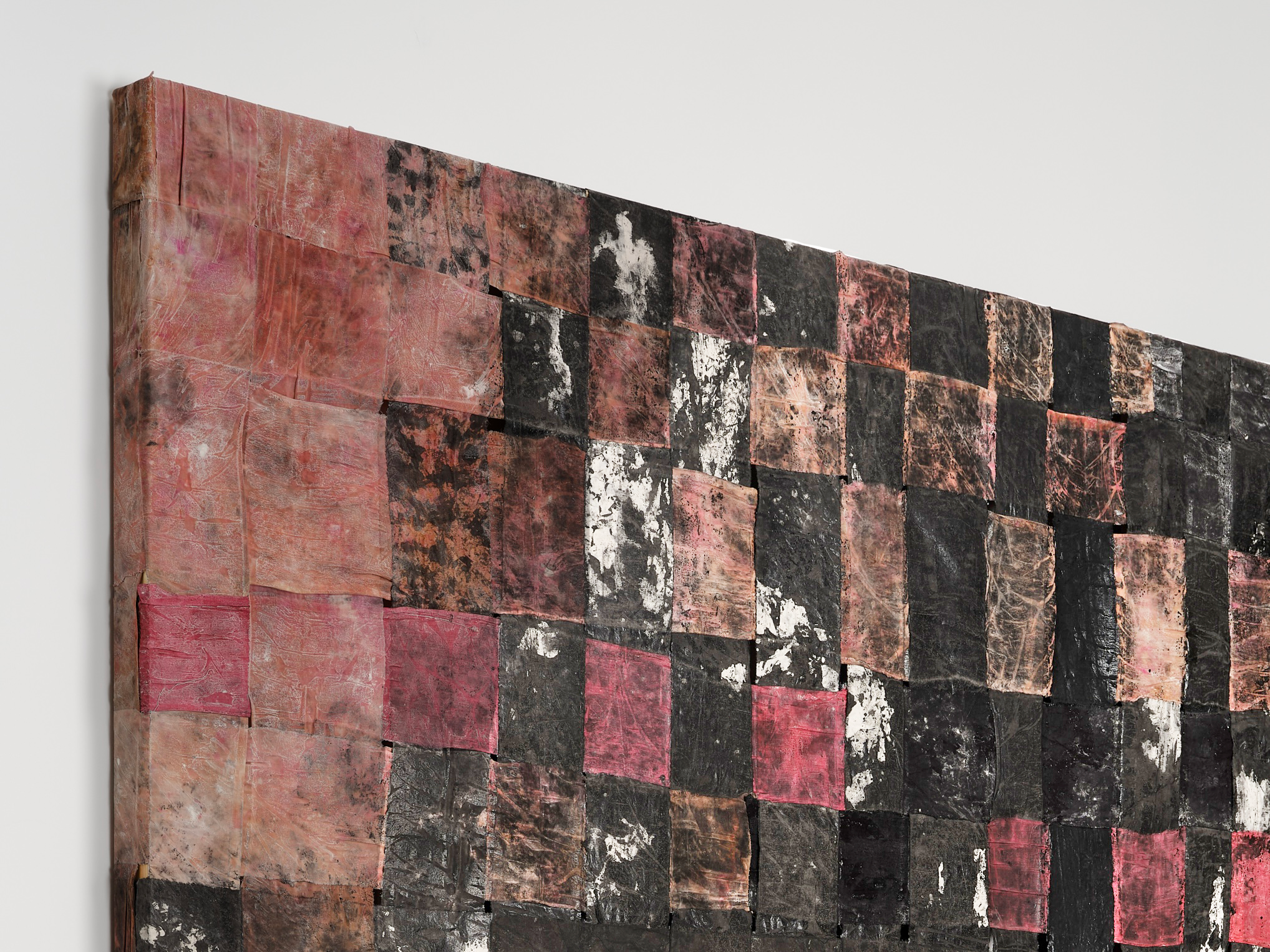 (Detail) Civil Dawn, 2026. Brazilwood and sumac dyed silk, ink, rayon, adhesive compound, 72 x 72 in; 182.9 x 182.9 cm