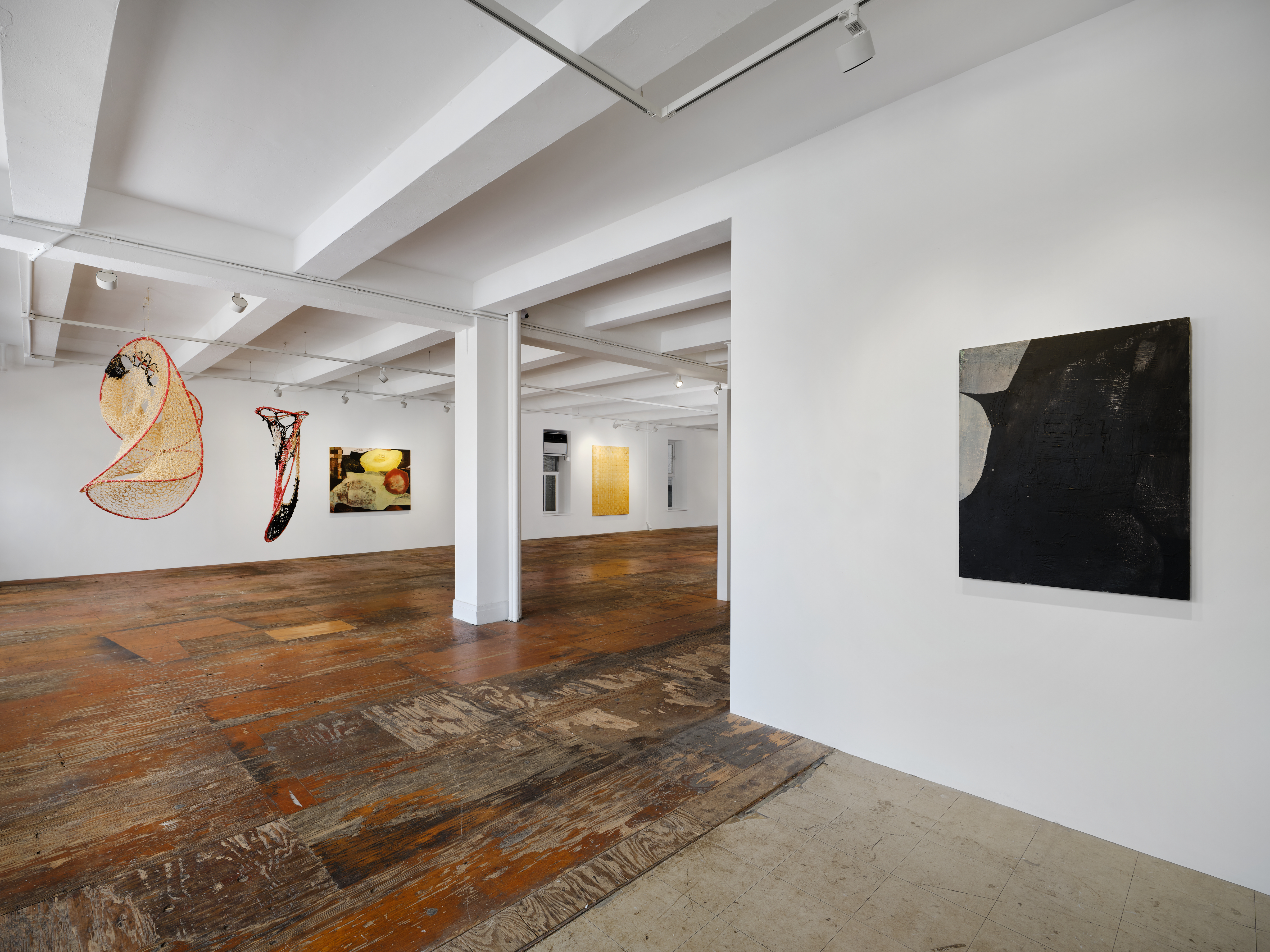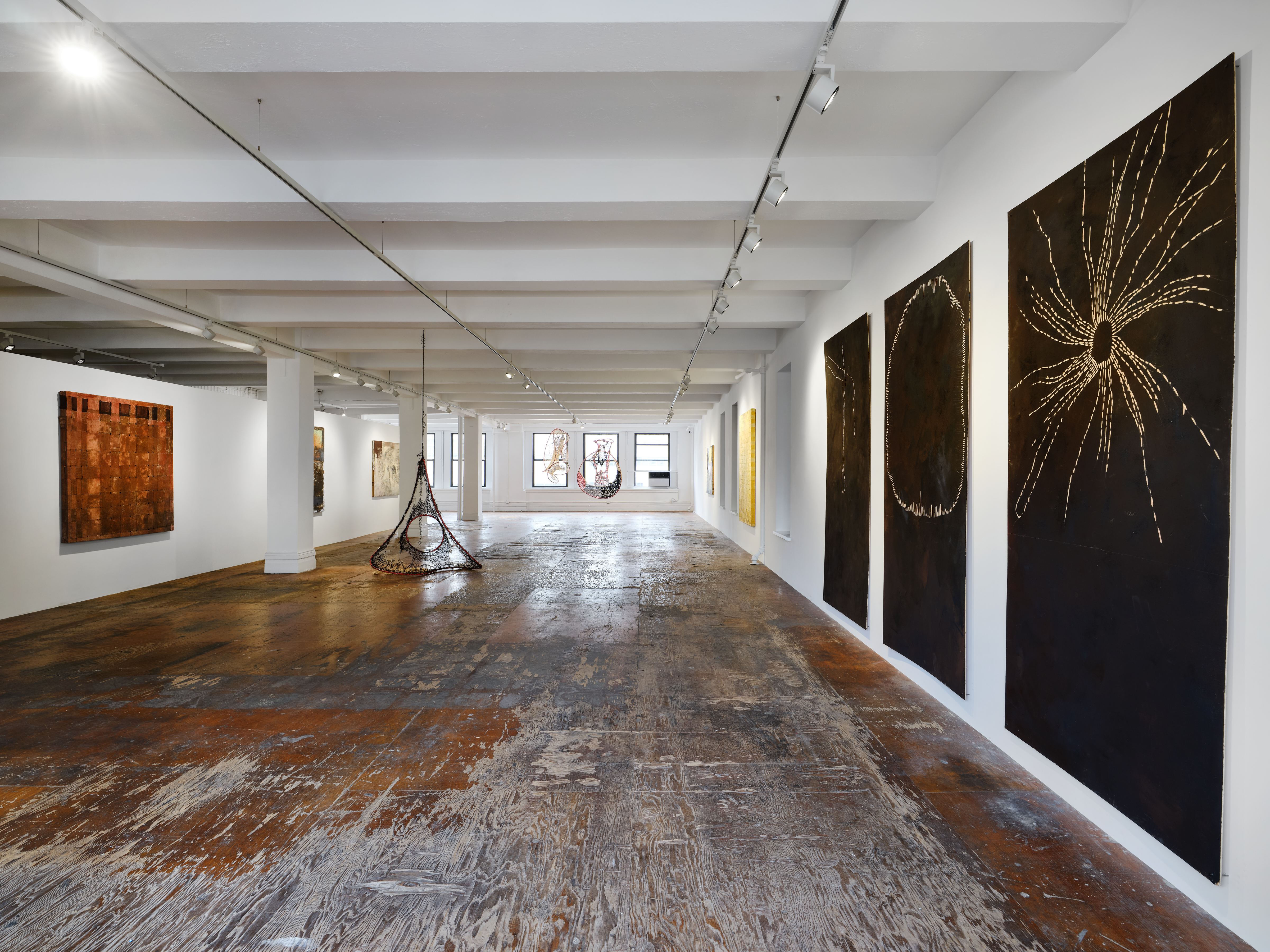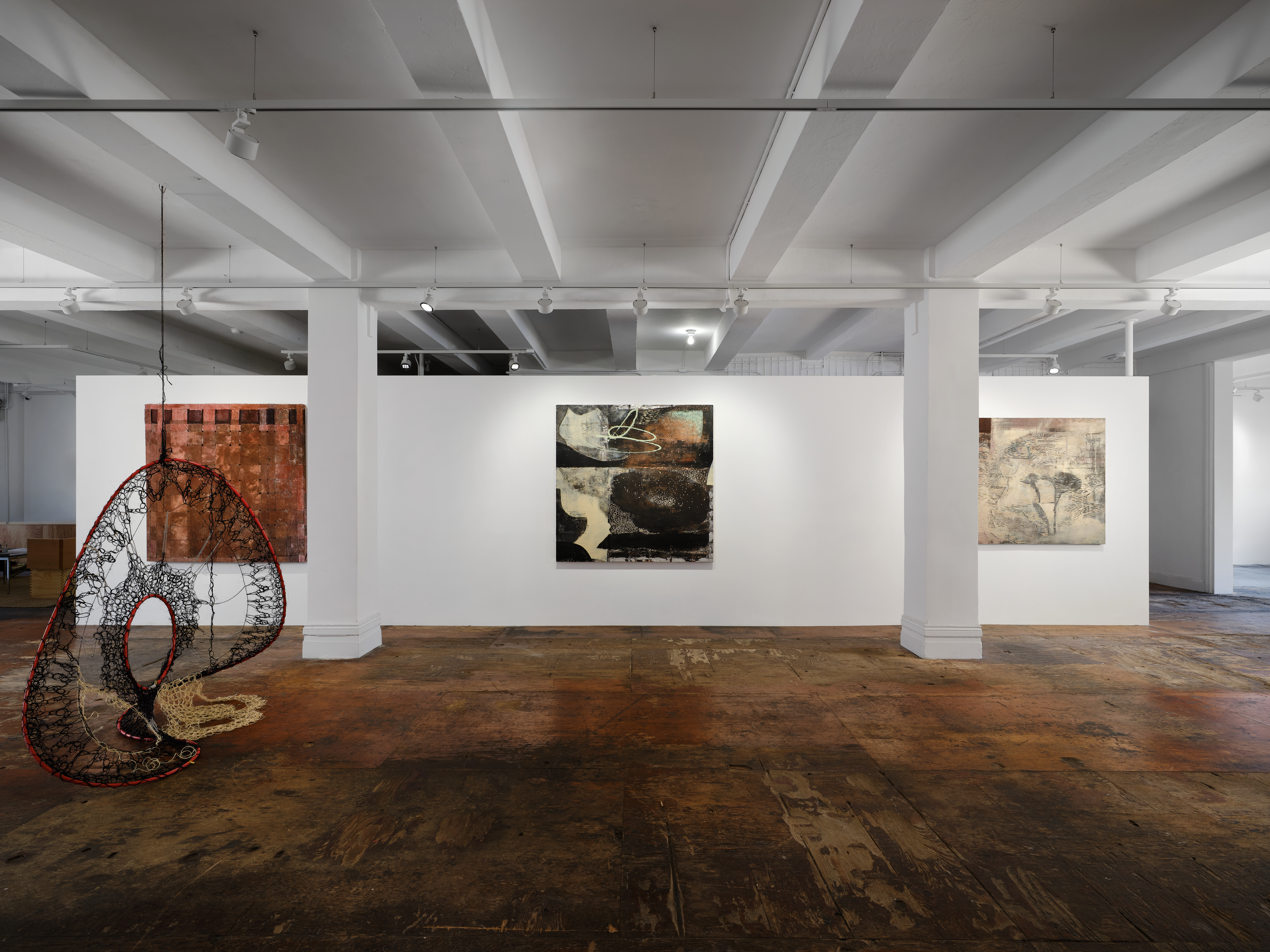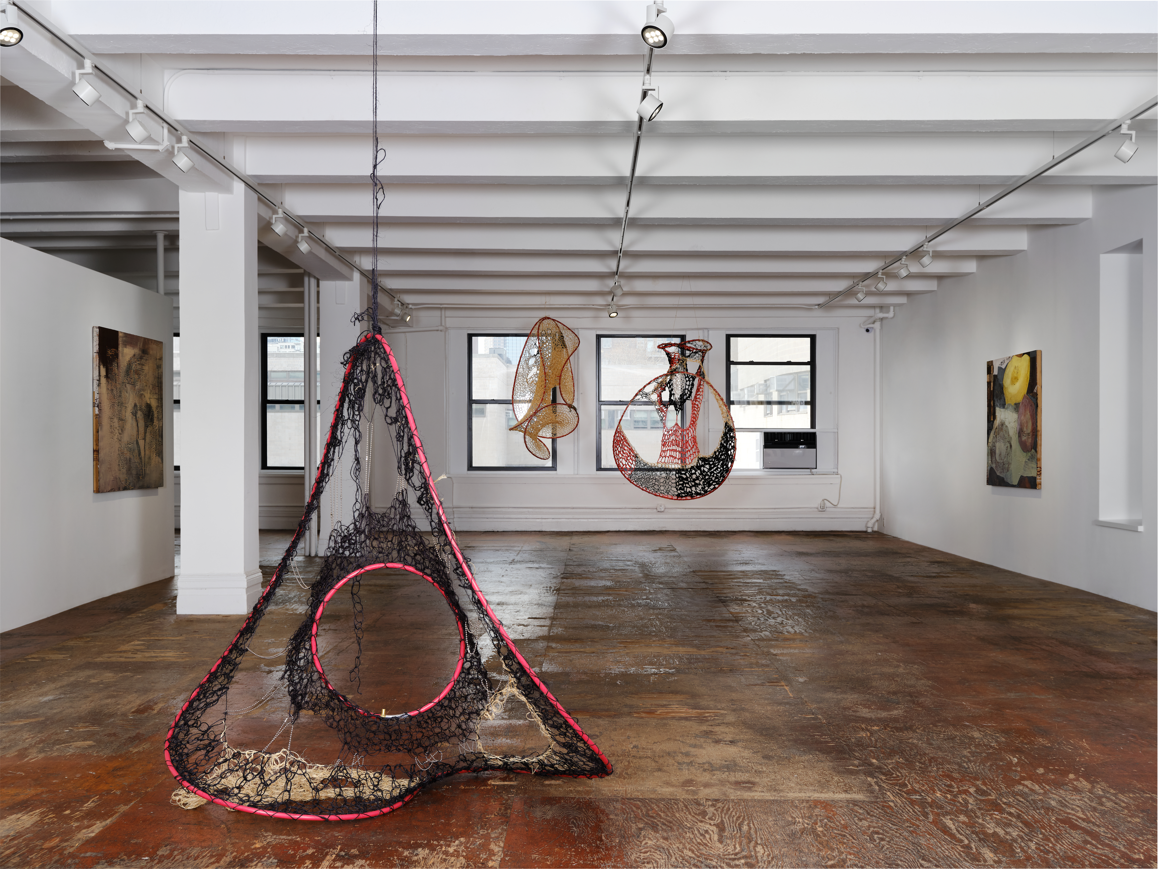 In a series of sculptural works, in supine position and in mobile suspension, that punctuate the gallery in spatial relation with paintings, Faria animates a choreography of forms, guided by her knowledge of pattern making, and interest in the transition of forms from two-dimensionality to three-dimensionality. Akin to drawings in space envisioning other worlds, the weaving of web and net formations converge into yet-to-be-known shapes that recall loops, spirals, helixes, atoms, and infinity symbols. A variety of natural and synthetic cordage, from thread, twine, to polyester nylon plastic rope, form what Faria terms the “social fabric,” which is then stretched into “systems” made out of malleable plumbing tubing joined by brass pipe connectors. Faria begins each piece from the center, radiating outwards like tree growth, simultaneously upwards, downwards, and in circumference. The use of sisal twine stems from her father’s farm in Brazil, where she first worked with the fiber to secure various bundles together. Brazil is the top producer of sisal, one of the cheapest natural fibers available, and requires a labor and time intensive harvest cycle. These sculptures, which appear as in the midst of mutation, draw a relationship between threading and reading, between the hands and the eyes, between movement and language. The viewer becomes an active participant by navigating in space through evolving perspectives.