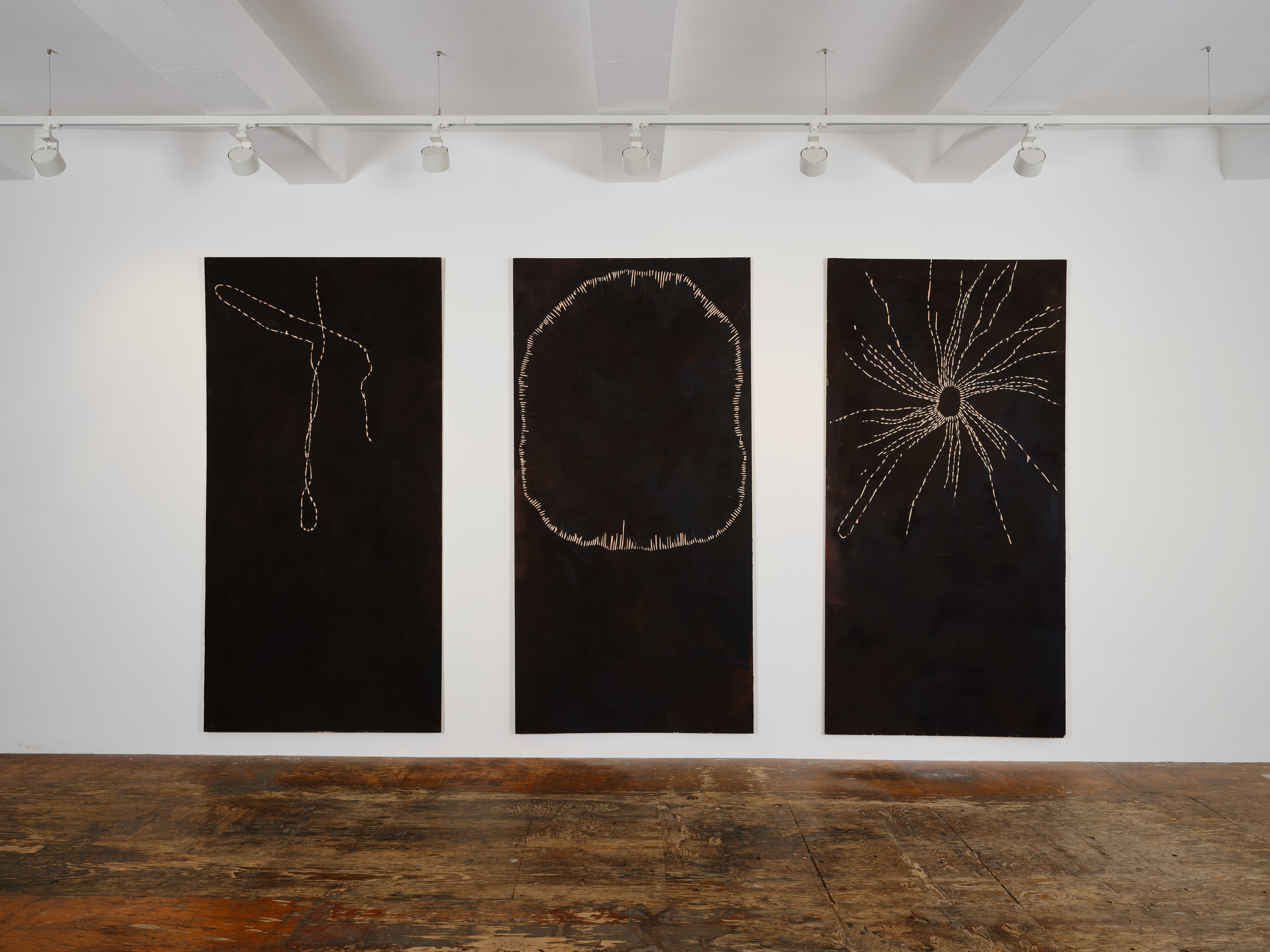 Quinha Faria activates a constellation of receptive fields, traversing natural and synthetic materials, and their transformation through woodwork and weaving, into paintings, sculptures, and installations. In a series of carved paintings, Faria begins with the subtractive hand tool woodworking methods of carving and gouging, with and against woodgrain into the substrates of birch, mahogony, and luan, where images emerge, recalling phenomena, such as landscape formation, climate occurrences, synaptic connection, or temporal leaps and psychic conditions. These markmaking are incipient records, offering shifting perceptual grounds that allow for interaction with a range of paint materials, including oil, acrylic, latex, sumi ink, pigment, tempera, fabric dye, tar, and medical-use skin marker. Toggling between actions of embedding, layering, and removing, the works, while appearing as abstract, operate as pareidolia, the human brain’s tendency to find shapes, such as in clouds, firing up our mirror neurons, as an empathetic response.
