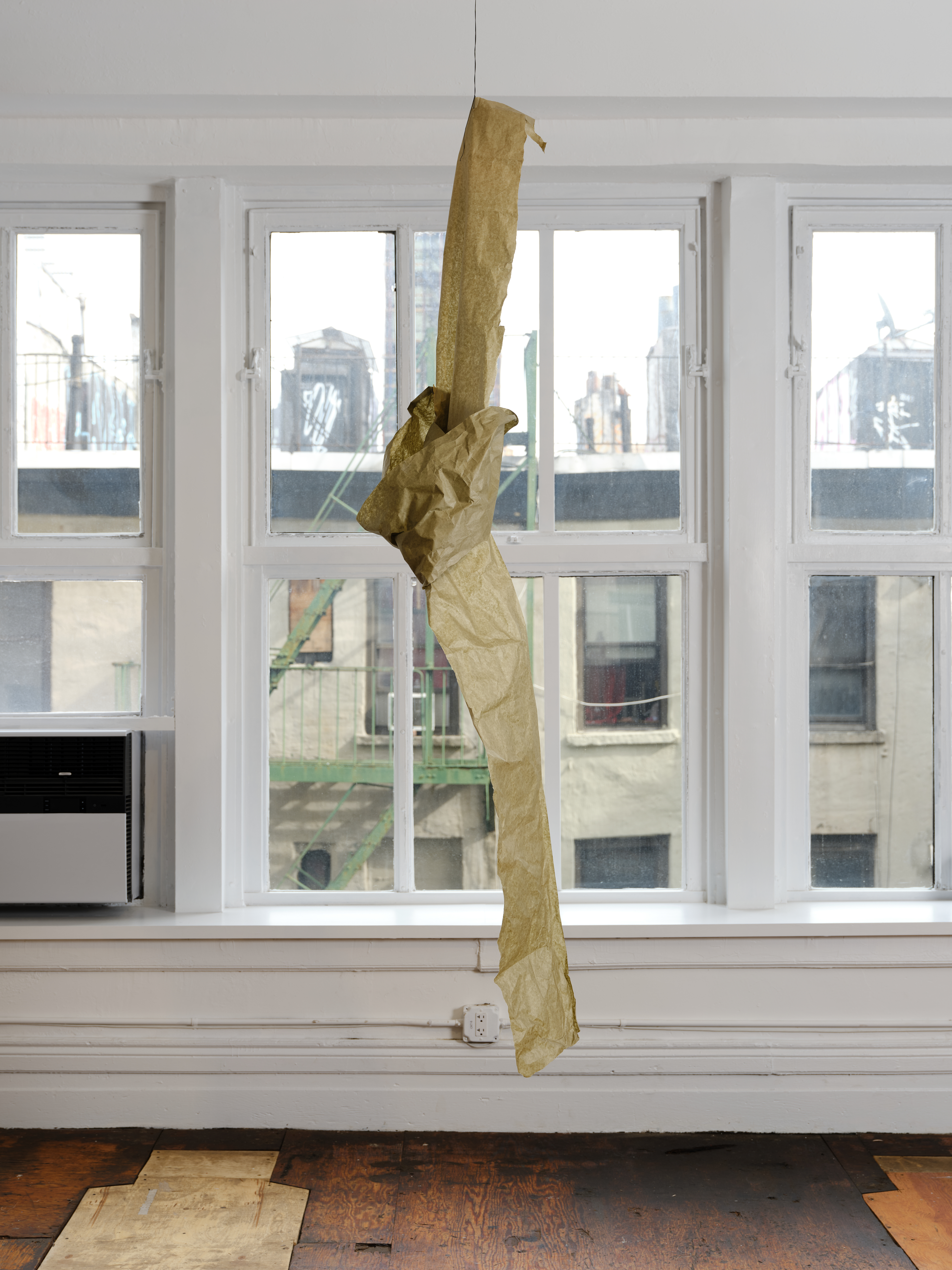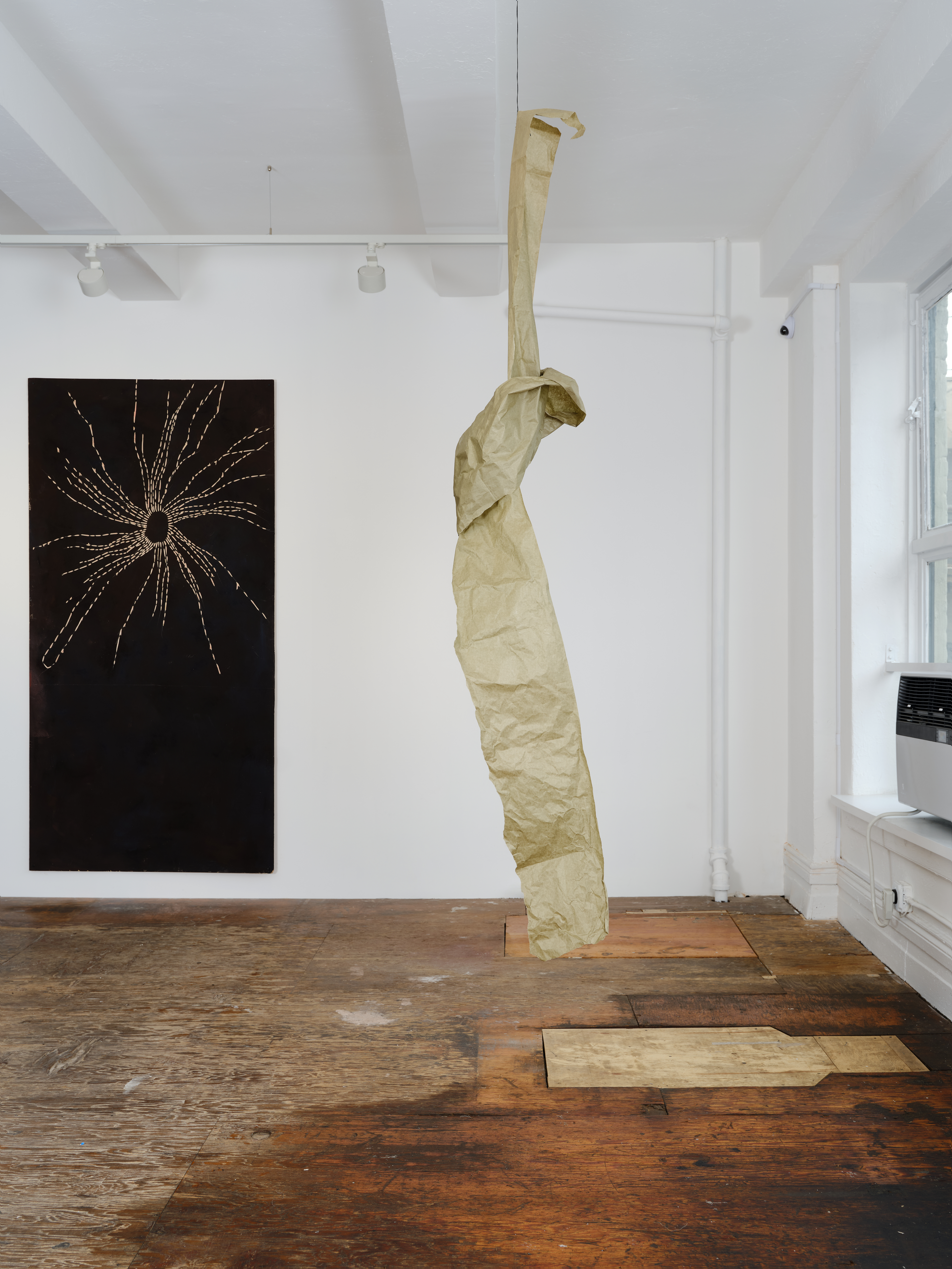 Canal, 2026. Sisal, zippers, fabric dye, masking paper, brass connector, pex tubing, 70 x 36 x 32 in; 177.8 x 91.4 x 81.3
