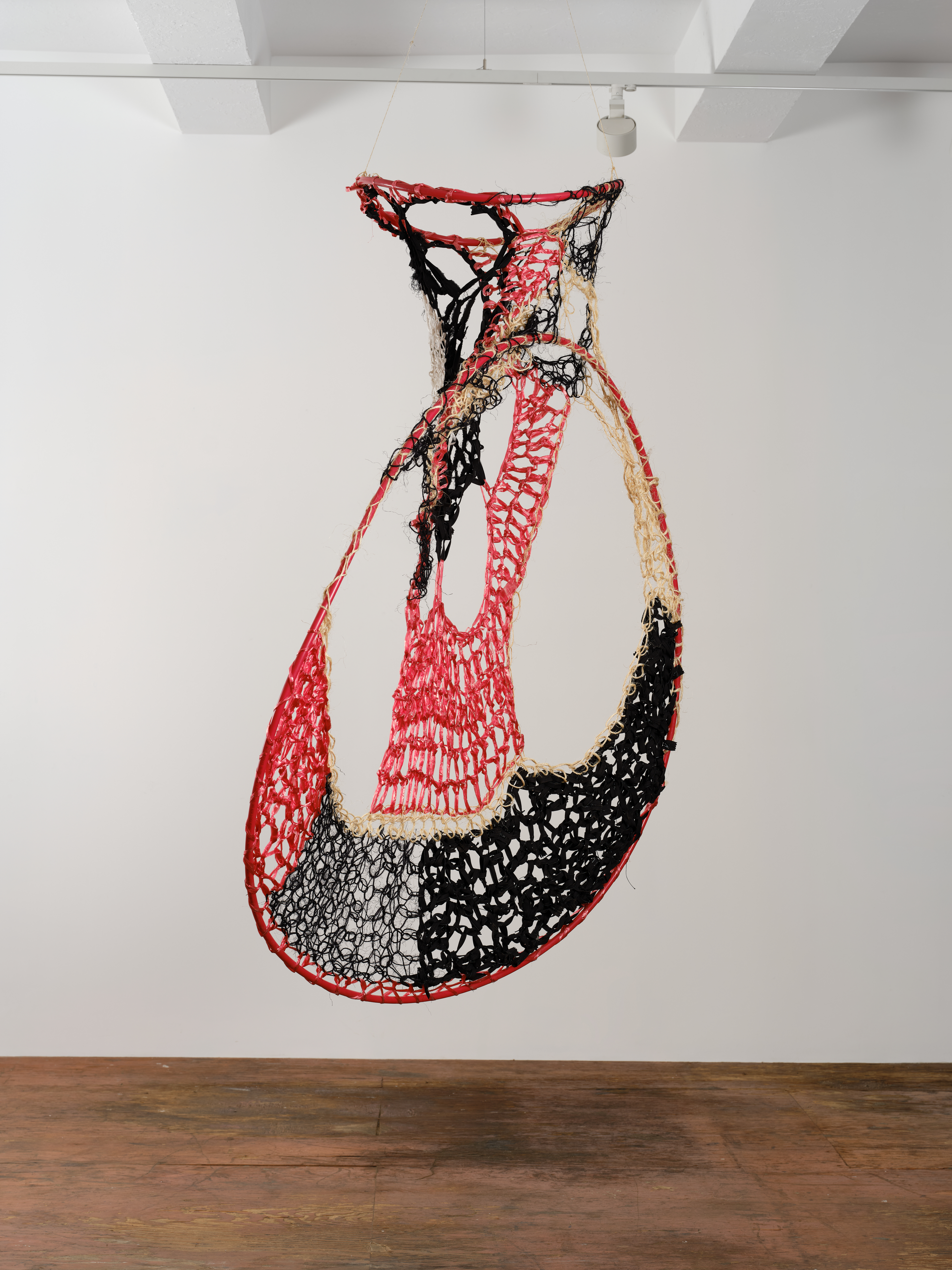 Sinus, 2026. Sisal, zippers, fabric dye, nylon, plastic, rayon, brass connector, pex tubing, 76 x 56 x 24 in; 193 x 142.2 x 61 cm