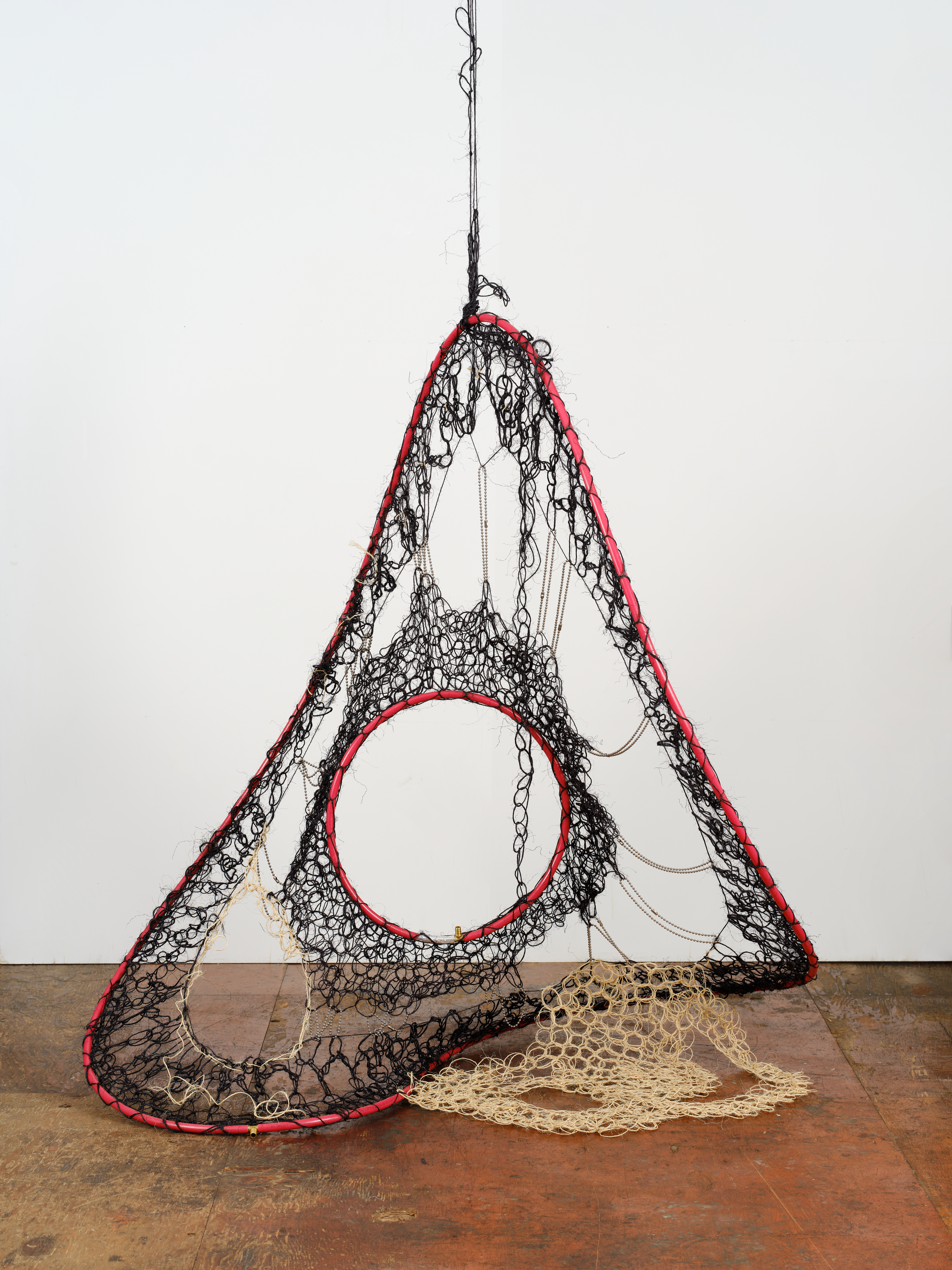 Hester, 2026. Sisal, fabric dye, hospital curtain beads, brass connector, pex tubing, 60 x 54 x 26 in; 152.4 x 137.2 x 66 cm