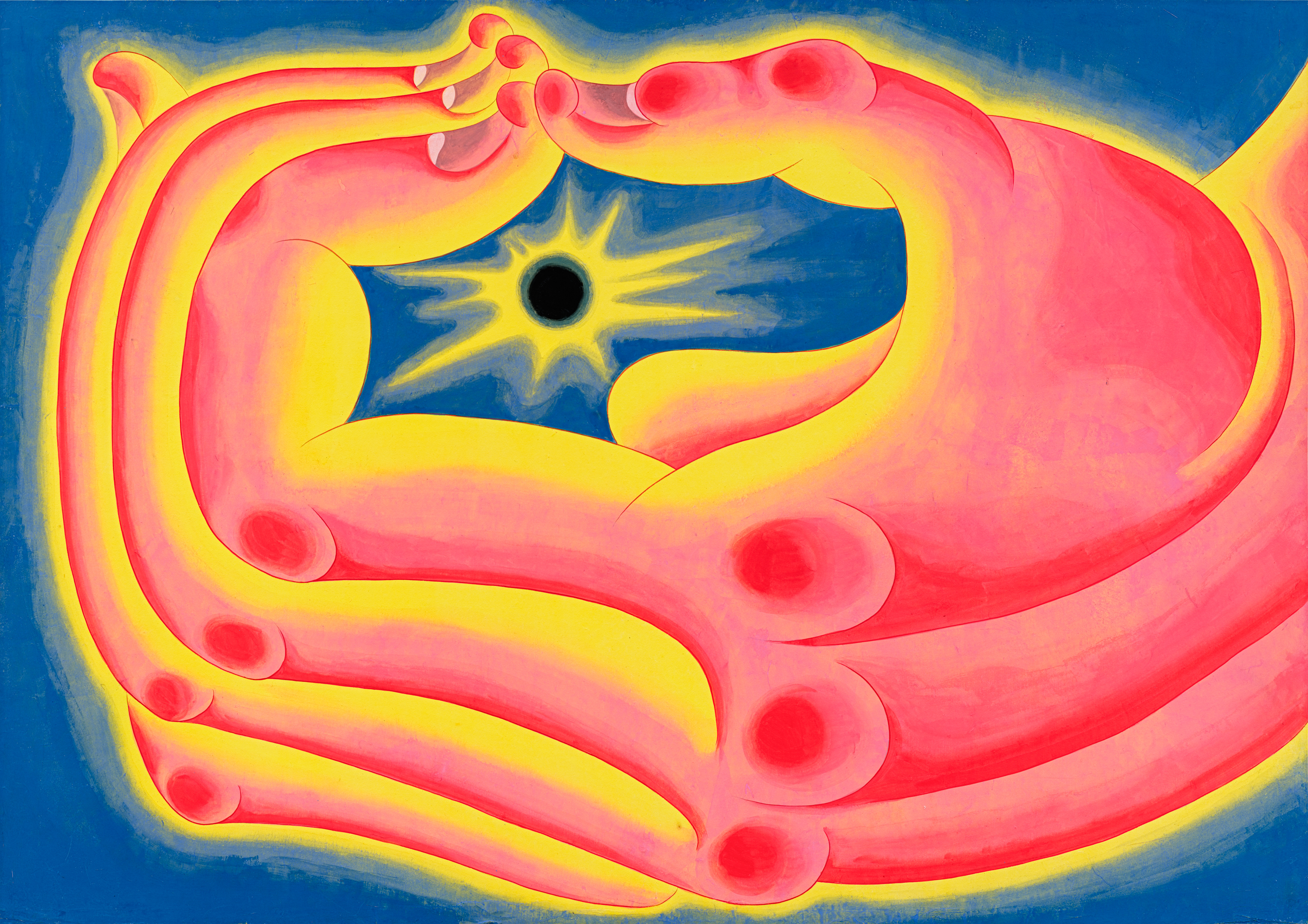 Tseng considers his work as a form of writing, a poetic system that probes contemporary conditions, politics, and collective psychology, and as a language that undergoes constant transformation: “My artwork is a form of rhetoric.” The anatomy of the hands operates as verbs, suggestive of a process of merging forms, between the individual body and an invisible external force. Further amplifying the concept of the “Imperative,” as in imperative verbs that give direct address of instruction, request, advice, and warning, are notions and acts of commitment and necessity. An open palm in Attunement (2026) takes on a sculptural quality, transformed into an undulating topography made up of crescent-like shapes echoing the moon on its upper right, evoking a cosmic attunement. In Iridescence (2026), an elongated hand with additional phalanges seems to reach towards something beyond that cannot be fully grasped. The hand can also operate as an organ of vision, enabling both internal and external perception. Singularity (2026) depicts a hand in vibrant yellow, red, and pink against a field of blue, its thumb and forefinger forming a narrow aperture, reminiscent of pinhole projection that allows for the safe viewing of solar eclipse. In Illumination (2026), the gesture of striking a match protected within shielded hands, with colors manifesting an auratic energy, transforms light and heat into a psychological field of perception.