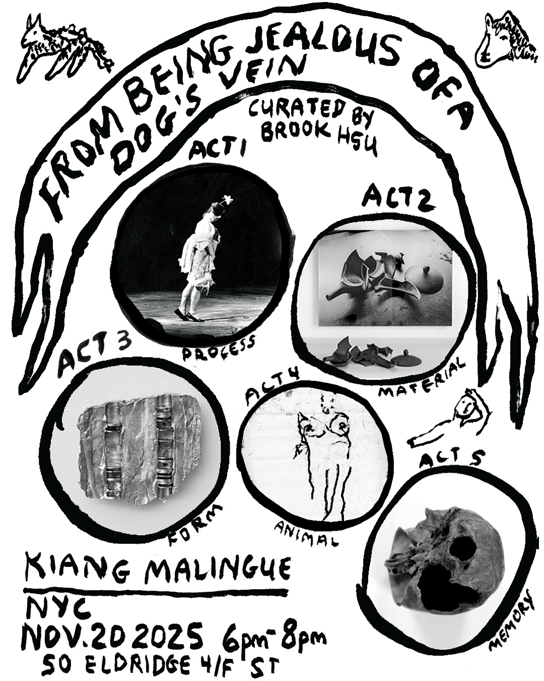 馬凌畫廊紐約空間榮譽呈現許鶴溪策劃的聯展「因為嫉妒狗的靜脈」,展覽標題來自暗黑舞踏創始人、舞蹈家土方巽1969年撰寫文本的標題。此次展覽檢視多種藝術形態,集中關注以紙本或陶瓷為創作基礎的藝術家,以及基於媒介延展潛能概念進行傳統形式——繪畫、雕塑、攝影、電影及行為表演——創作的藝術家群體。